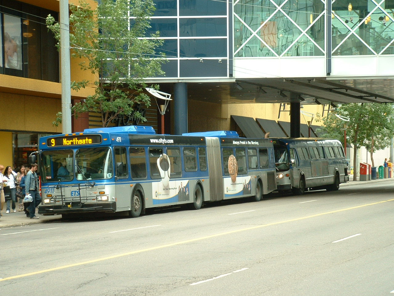Further downtown is Edmonton's first aric, New Flyer D60LF 4900, one of six new in 2001. Following is D40LF 4287 from a batch of 66 also delivered with the first artics.