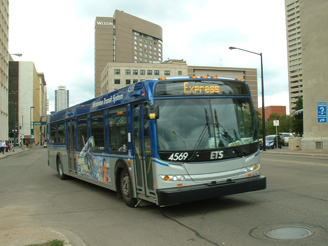 New Flyer 1998 D40F 4076 can just be seen emerging from one of the several bridges crossing the North Saskatchewan River.