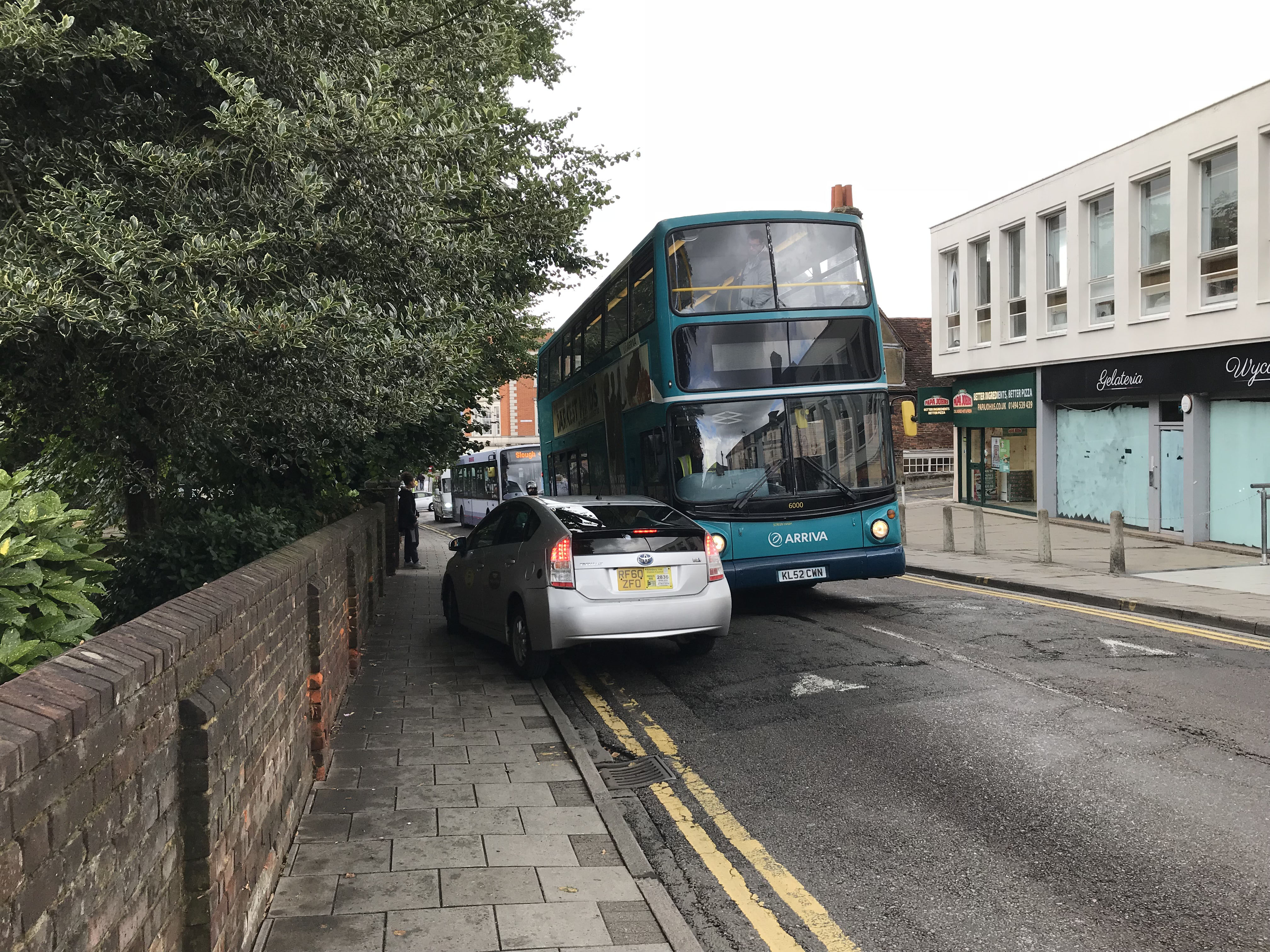 Here is the rear end of 6004 (KL52CWT) an Alexander ALX400 bodied DAF DB250 new to Arriva the Shires in London red for contracts worked from Garston depot in Watford. Seen in High Wycombe in July 2018 it has entered the pedestrianised zone cut through that links the two side of the town centre. Despite "No entry except buses" signs the Porsche driver has chosen to ignore them, a common occurence, as the signage implicitly exempted drivers of black cars made in Germany. After some years of "Wild West" lawlessness the situation was resolved with enforcement cameras and ramped up signage. There is still the occasional driver, blindly following GPS/satnav who blunders into the zone, but otherwise drivers do not risk the fine. The only ones who think they continue to be exempt are Deliveroo, Ubereats, etc scooter drivers who think it is okay to plough into a heavily pedestrianised area without the obvious advantage of being a highly visible ten ton bus.