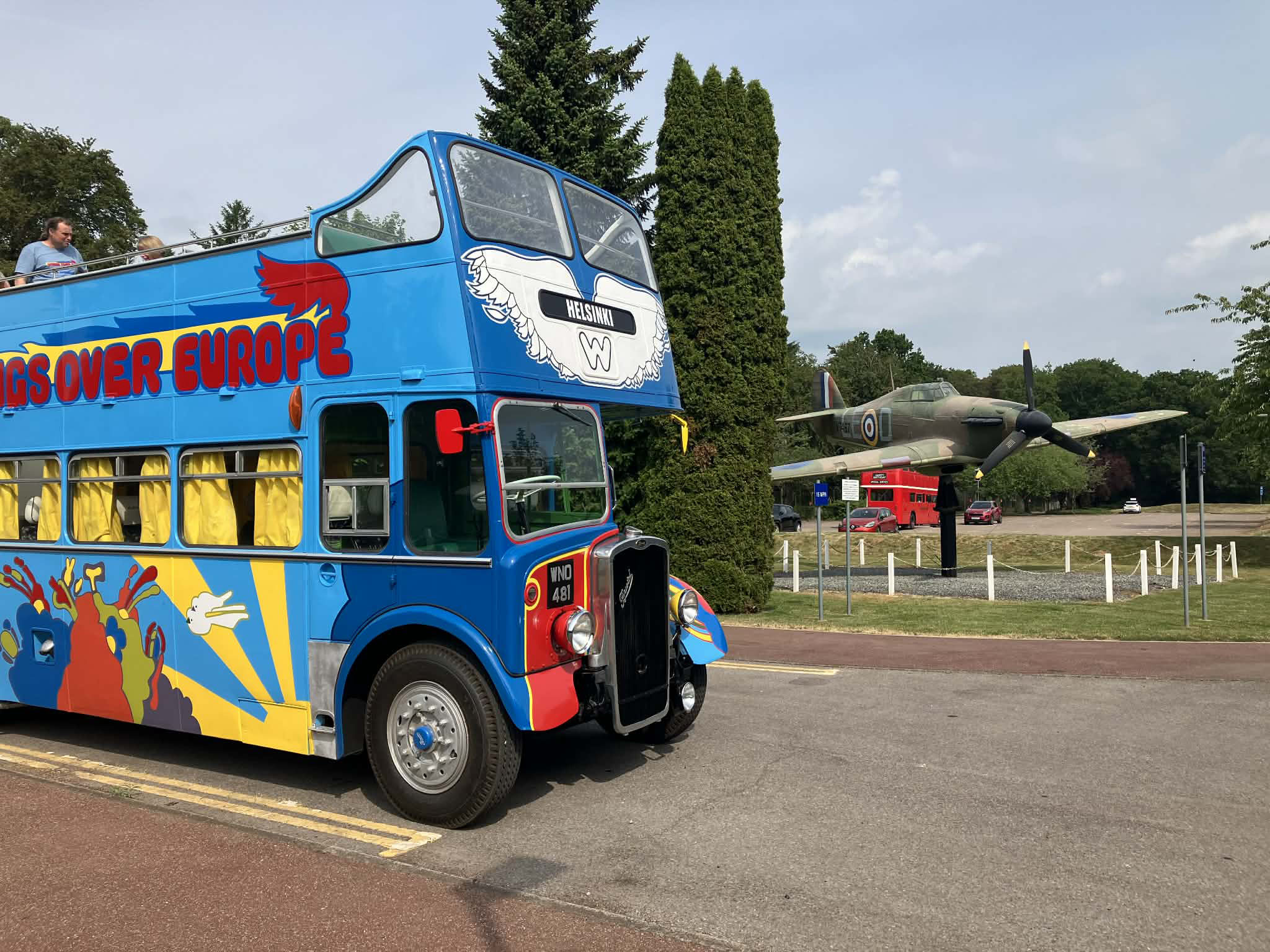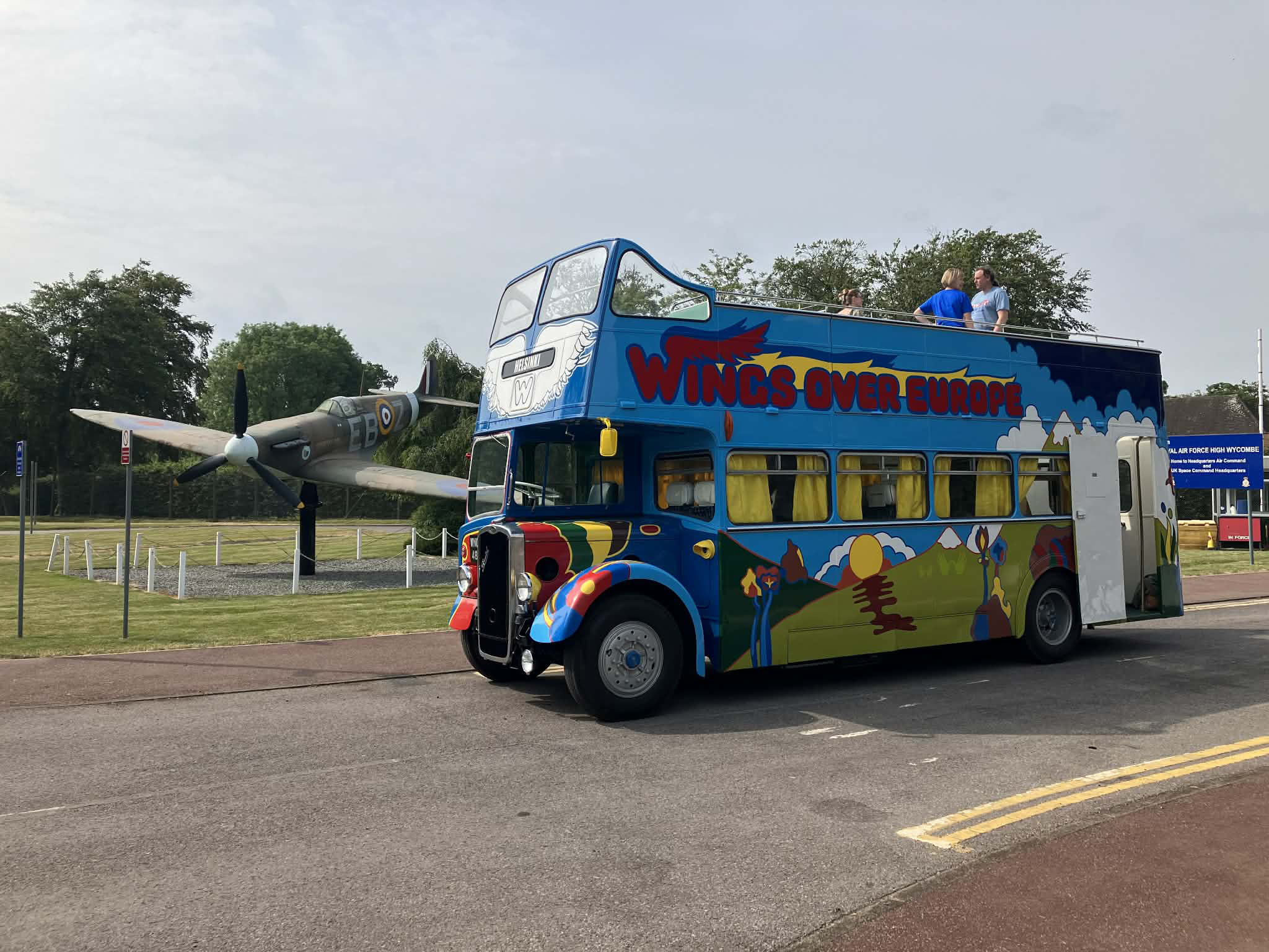 The bus was an early arrival at RAF High Wycombe and posed specially by the twin Spitfires at the front of the establishment.