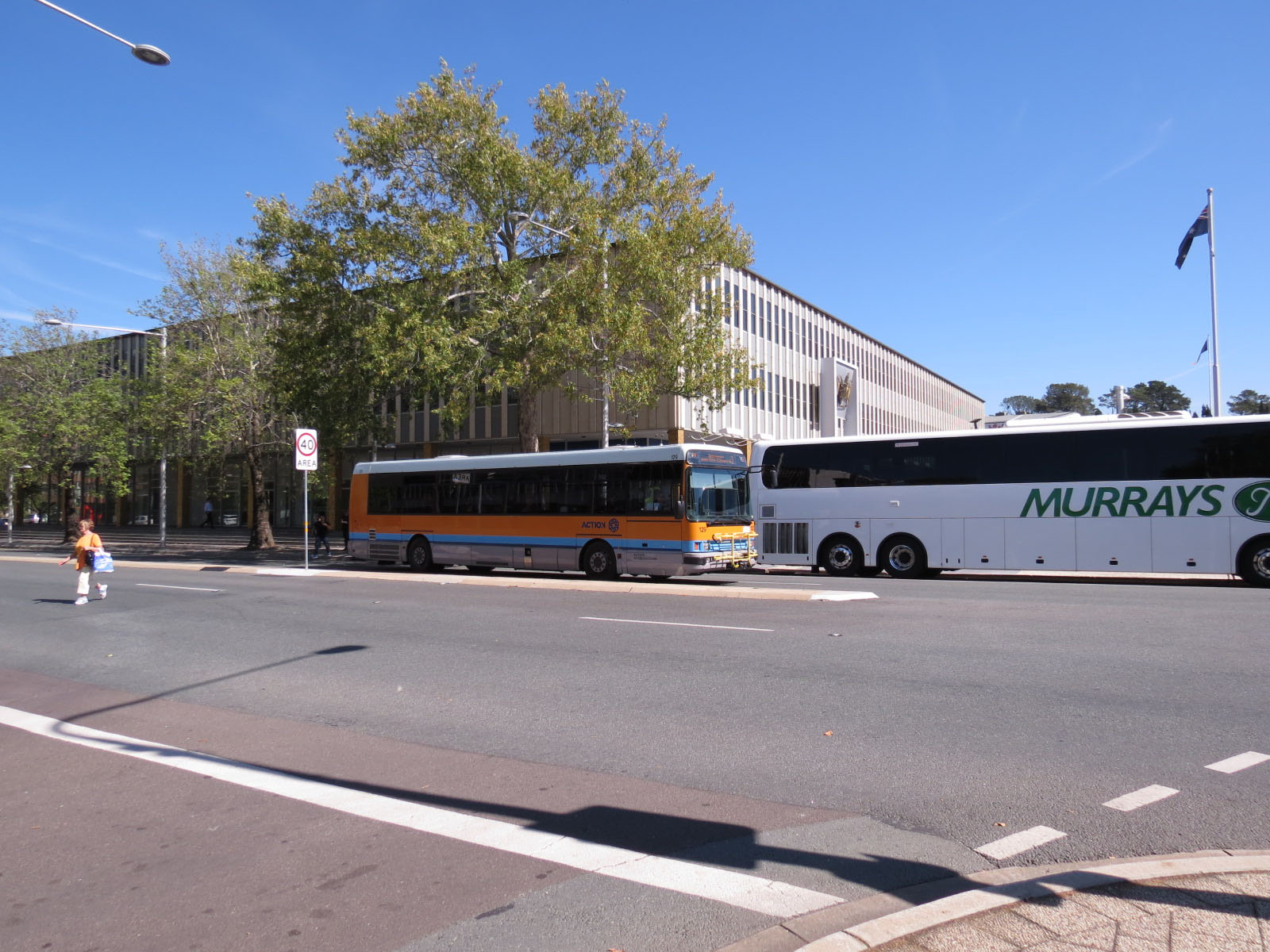 Fourteen years later, the PR100.3 machines were still in action with ACTION. Renault 129 (BUS129) is seen in April stopped behind one of Murray's BCI coaches employed on the express run to Sydney. |
