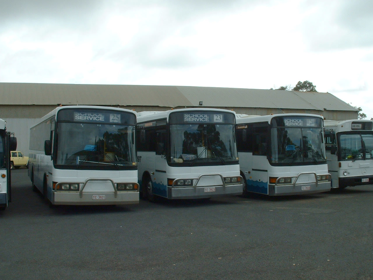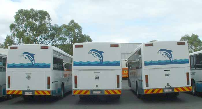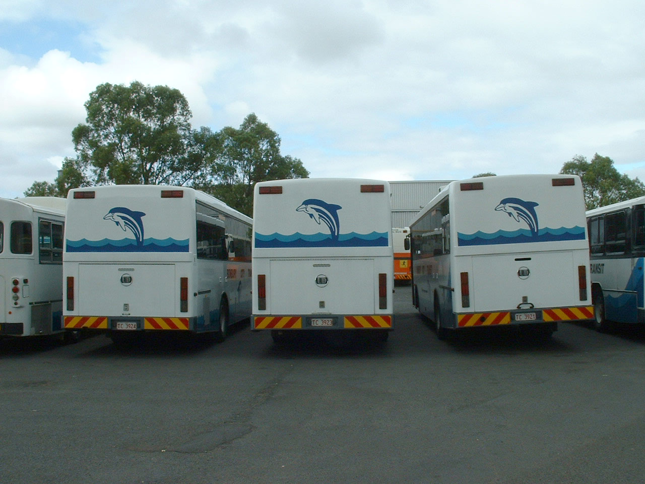 Great play is made of the dolphin logo as can be seen in this rear view of Bunbury's batch of Nissan JP251P buses, seen at the depot in April 2006.The BCI-Gemilang bodied buses are part of a batch of five, TC3920-3924, delivered new to Eastern Goldfields Transport Board in Kalgoorlie in 1999. All transferred to Bunbury and, with the exception of TC3920, on to TransBusselton as 824-827 (UQB824-827). From left to right above we have TC3924, TC3923 and TC3921.