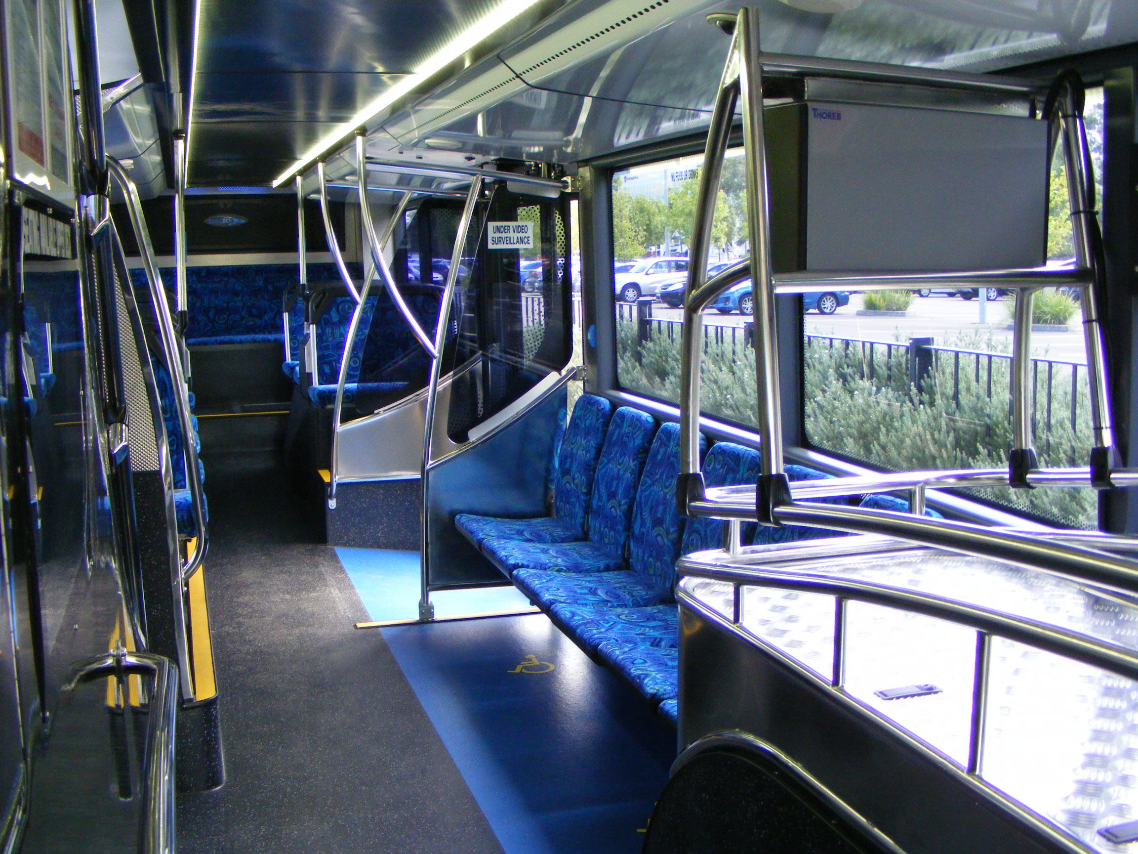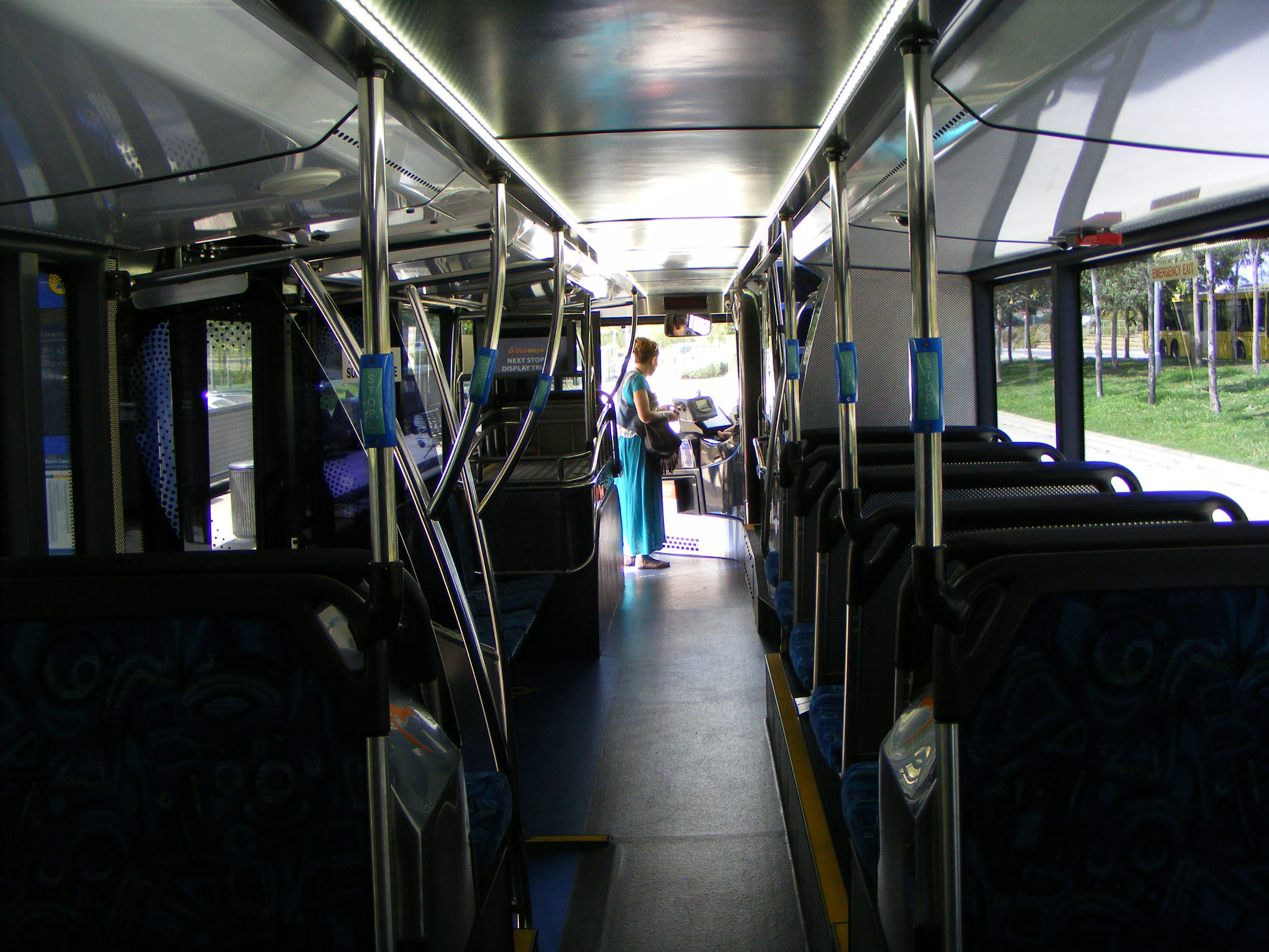The view in the lower saloon looking from front to back. The blue interior gives the bus a cool welcoming air on a hot day: the extensive use of stainless steel a utilitarian look. The long transverse bench of tip-up seats provides possible wheelchair space.