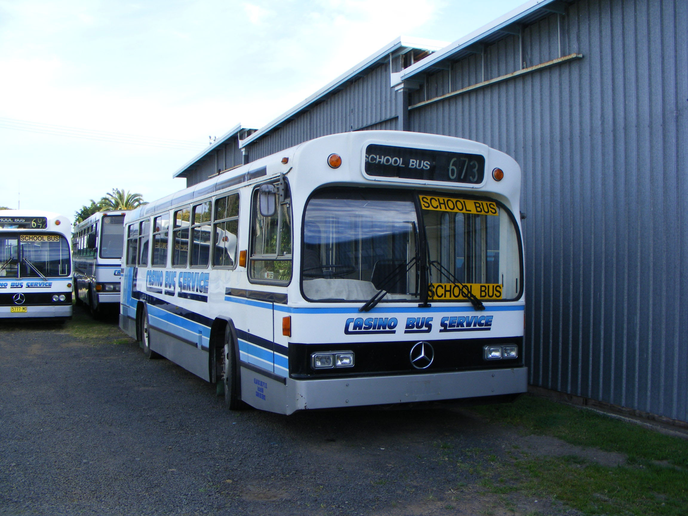 More modern equipment in 2009 came in the shape of a pair of Mercedes O405NH Bustech combinations dating from 2000 and acquired from King Brothers when only three years old. This is 27 (MO5772), previously MO5204, its sister is numbered sequentially. Though seen here on a school run, Casino does provide local bus services in the township of Casino. Both O405NH buses were sold to Dion's for their Uni shuttle, this one becoming TV8339, the other TV8340. it was withdrawn when the Uni service was cut back during COVID and sold to Moore's Tours of Carss Park gaining new rego TV698A. |