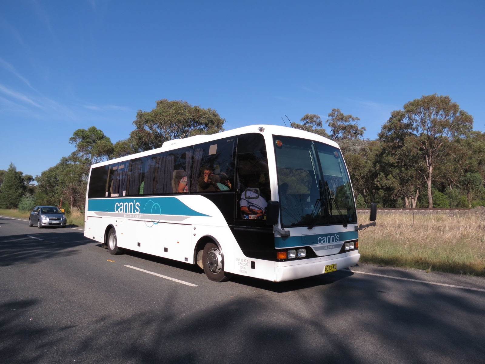 What may be the same coach is Cann's Bus Service of Albury and Cowora 28 (6313AO) seen near the NSW border in April 2014. The Coach Design bodied MAN 10.180 had been Cobb 85 (4016AO), but had also been with Rutherglen Bus & Tour Services named Scarlett and was with Jubo Coaches in Ramsgate, NSW. |
