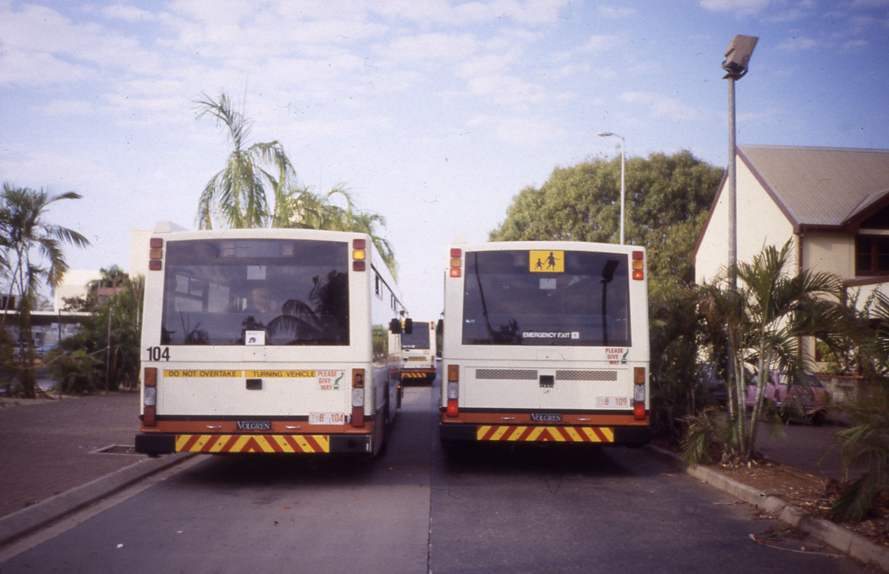 Sister vehicle 101 (MO 8 101) is seen in Darwin Bus Station in the company of two Buslink Volvos in August 1997. |