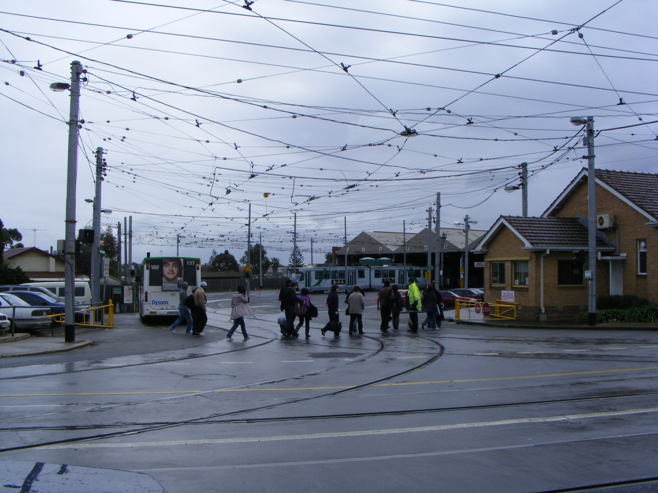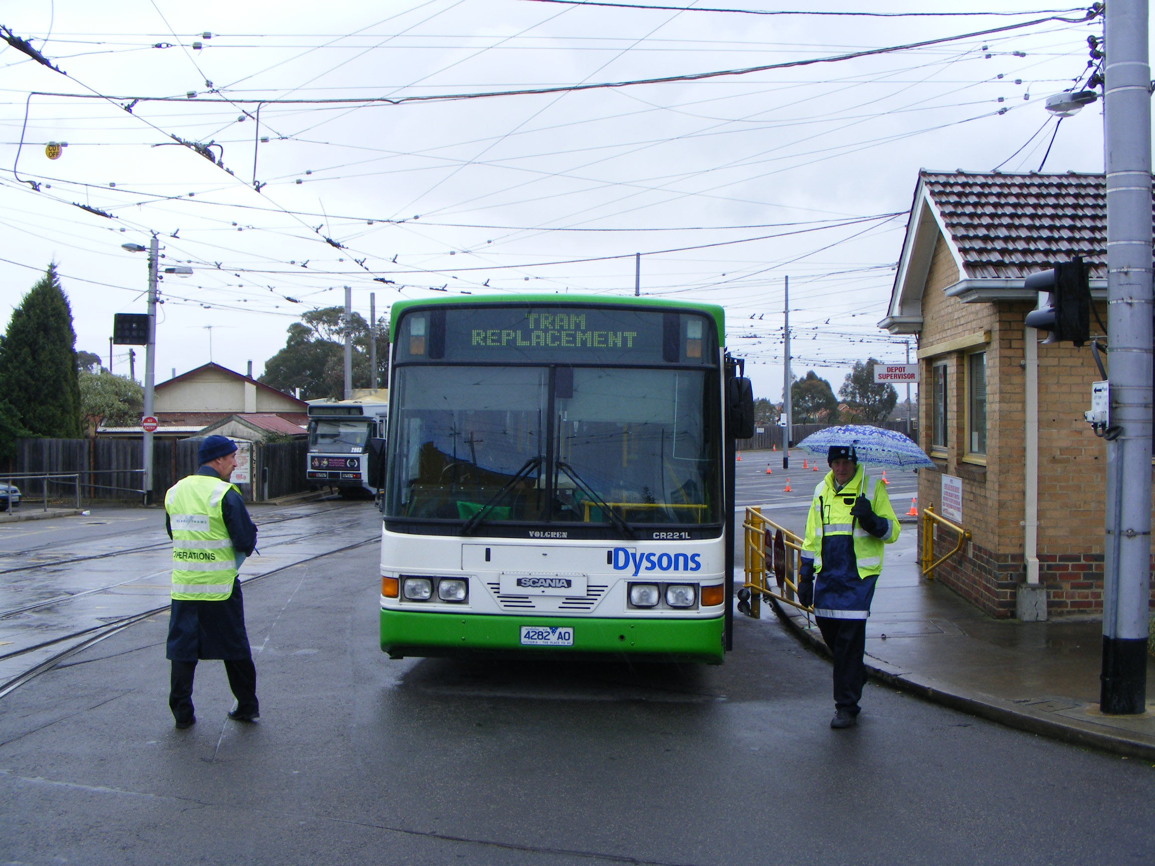Dysons was a popular choice for tram replacement work. Seen at Preston tram depot one Sunday in August 2008 is 129 (4282AO) a 1998 Scania L113CRB with Volgren CR221L body about to head north to Bundoora, the tram having completed the part of the 86 run from Docklands and the city.