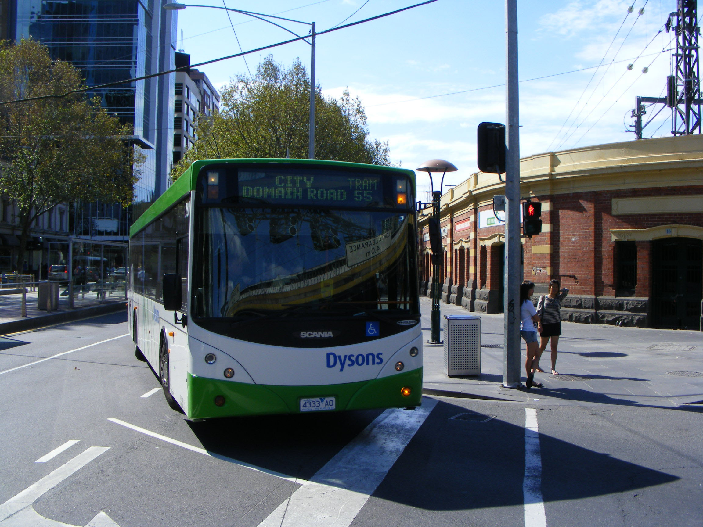 Replacing trams on the 55 through the city in April 2010 was Scania L94UB 280 (4333AO). Sporting the relatively short lived CR227L body, it is seen in Flinders Street.