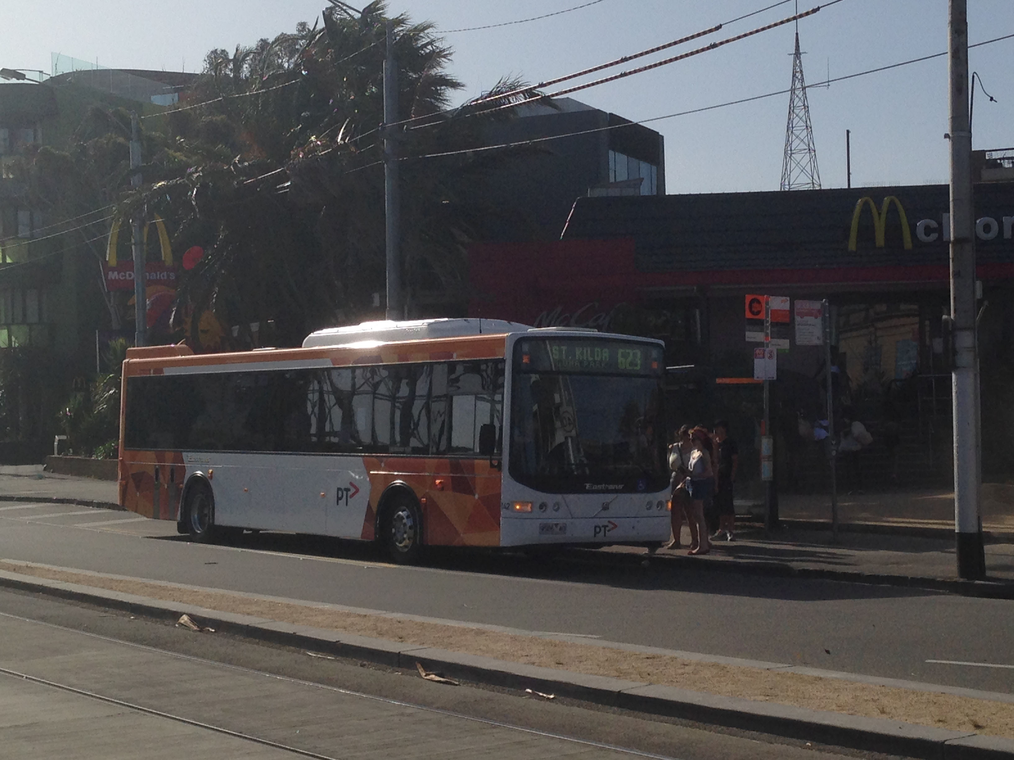 Seen when only two months old is Volgren bodied Volvo B7RLE 142 (9586AO) at St Kilda Triangle between Christmas and New Year in 2013. The bus is operating former Driver route 623. |