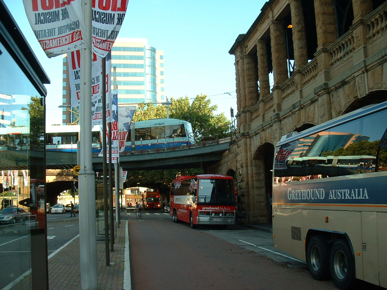 Christmas 2007 season and a Greyhound Australia MCA is seen with a Sydney Light Rail (SLR) tram as well as a City Sightseeing MCW Metrobus open topper at Sydney Central Station.
