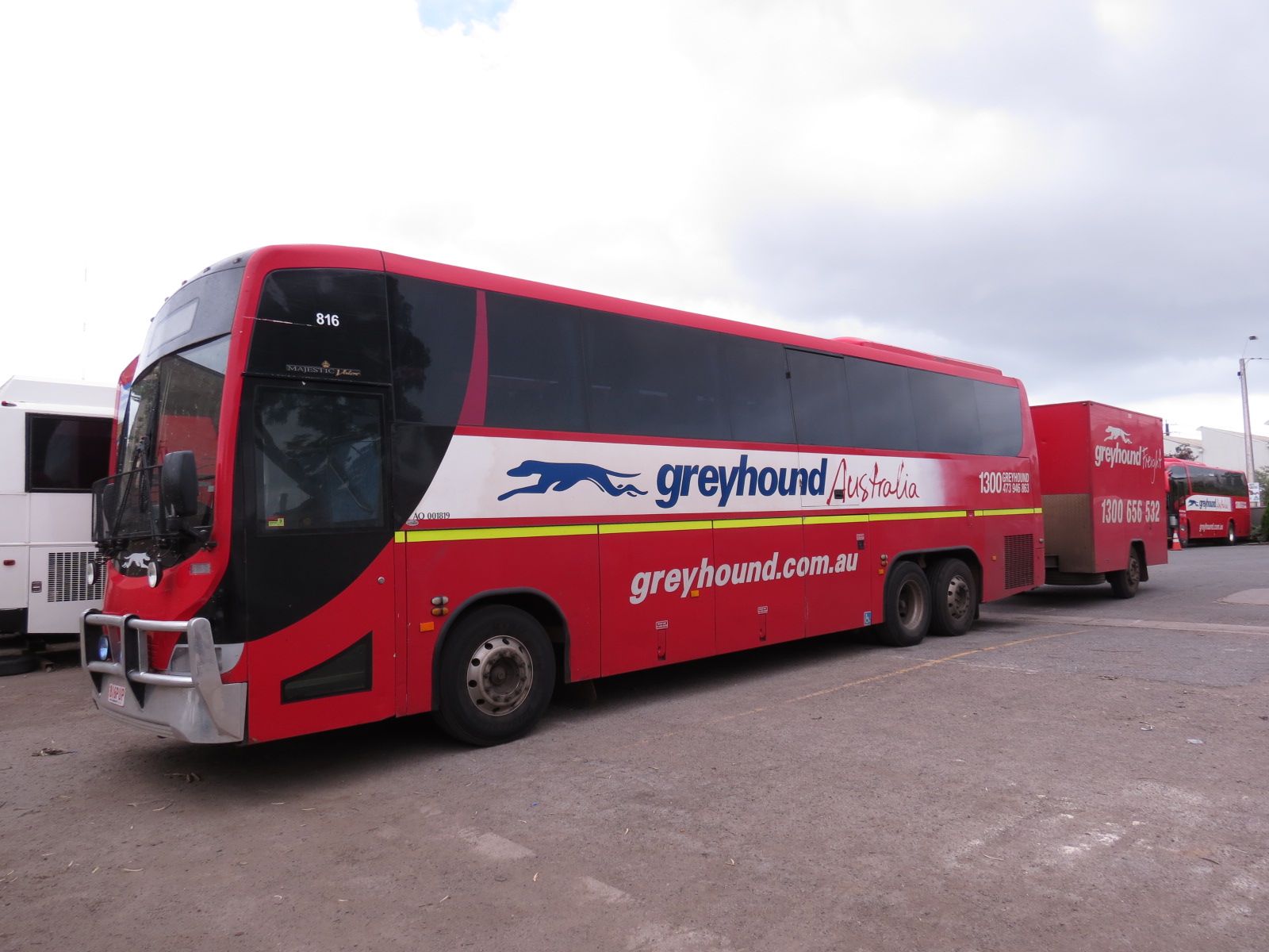 With 822 was sister 816 which was just a pup, with rego 816PUP. Both vehicles, new in 2007, were being hosted by Grants. The "pup" is hauling one of Greyhound's luggage trailers, which sometimes double up for freight movement. |