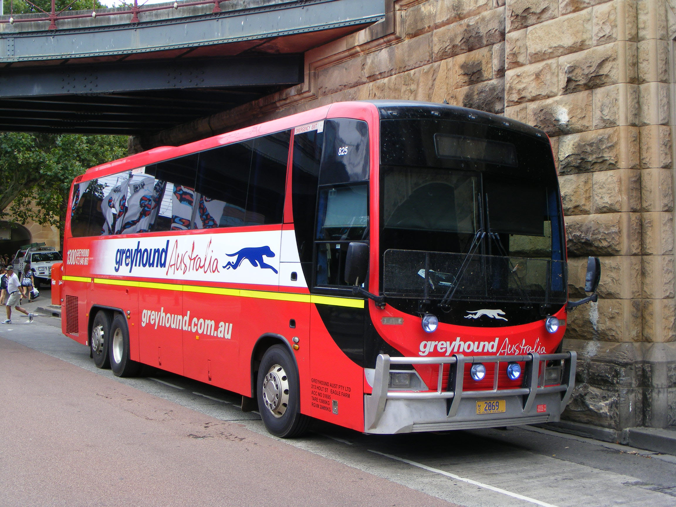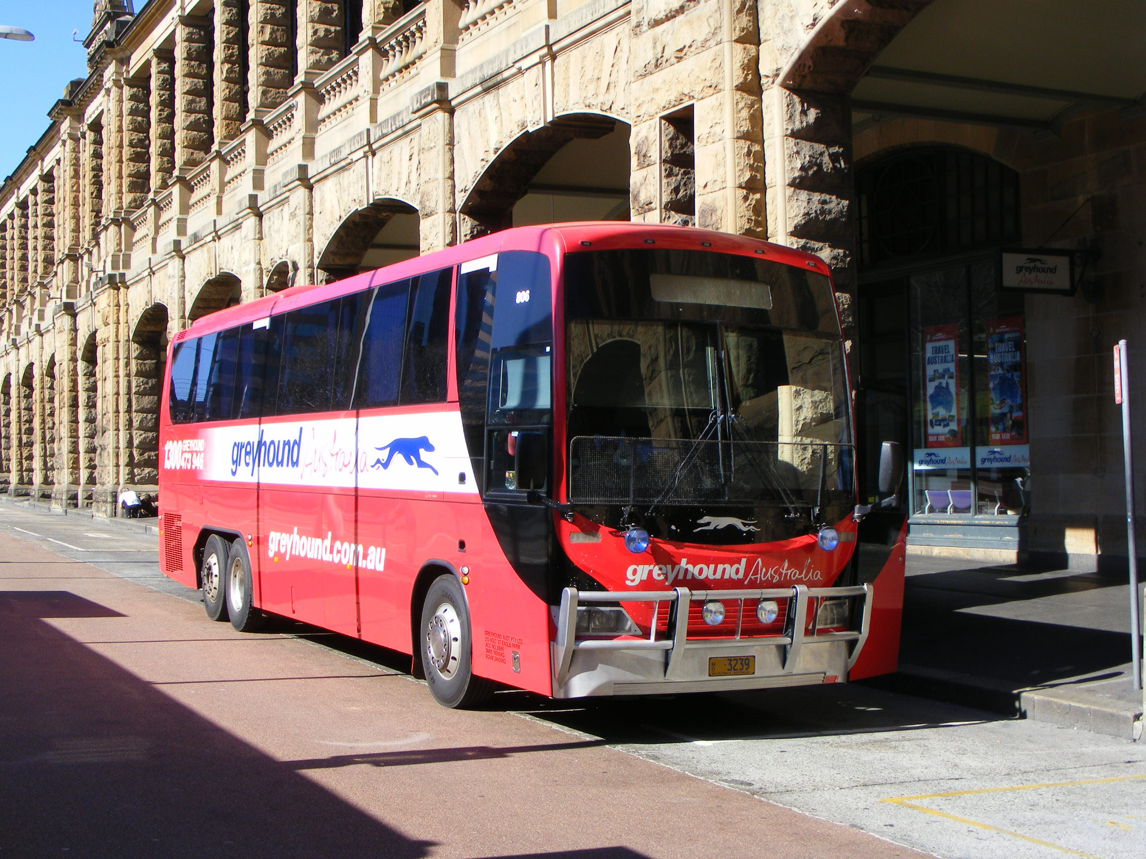 Head several thousand miles south and twelve months later and sister vehicle 806 with Northern Territory plate MO3239 is seen outside Sydney Central. Notice the greyhound on the front dash is running in the opposite direction.
