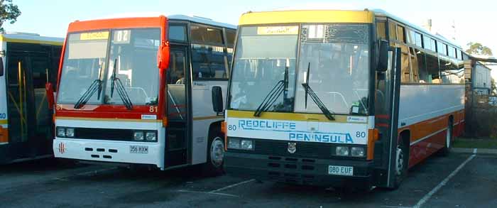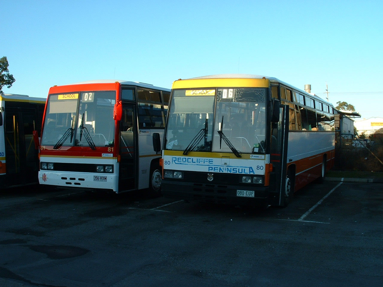 Two Austral bodied Leyland Tigers sit side by side in late July 2004 in the Clontarf depot. On the right is 80 (080EUF) branded for Redcliffe Peninsula, Hornibrook exclusively serving this area with its fleet of around 60 buses. In standard livery is Tiger 81 (355HXM). Both buses were new in June 1990 and were sold on together to Garden City Sunbus of Toowoomba. |