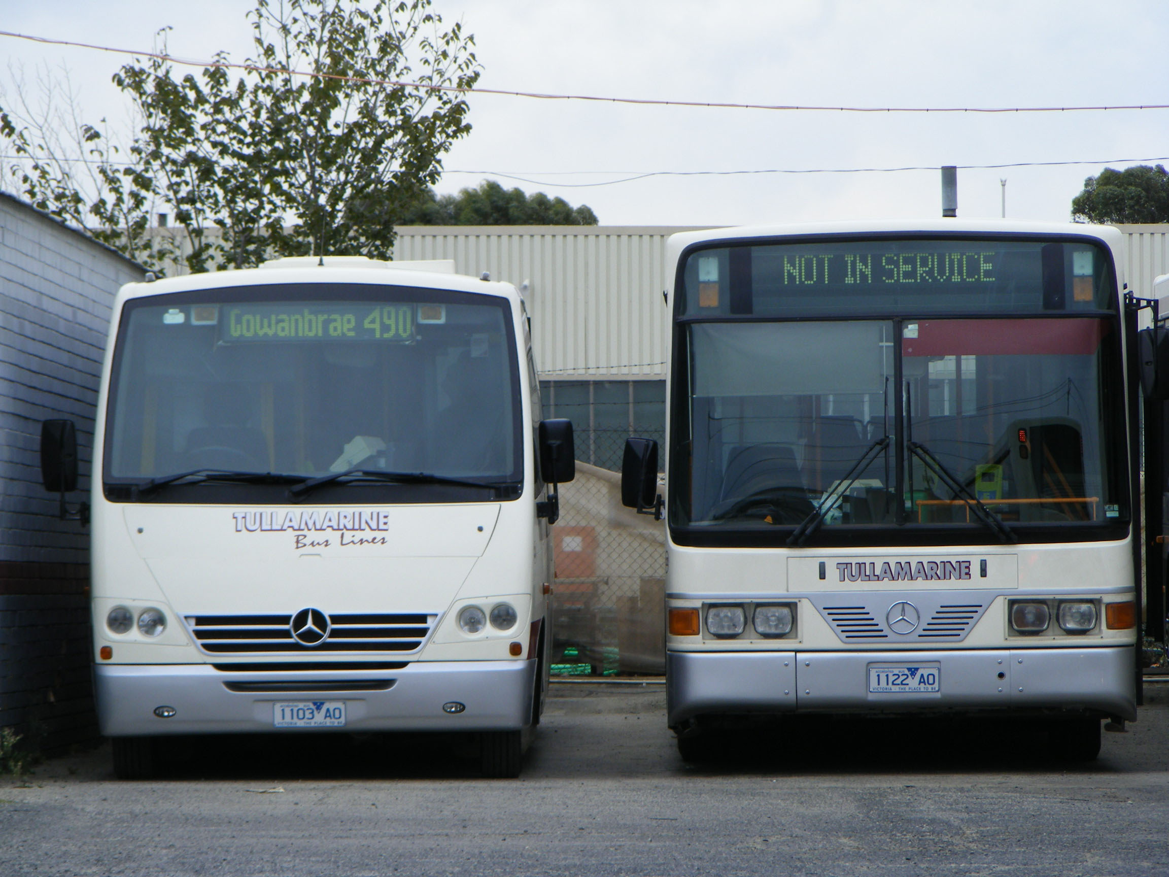 The bus is seen again on the same day parked up at the Tullamarine depot with Volgren bodied Mercedes O405NH 22 (1022AO). |