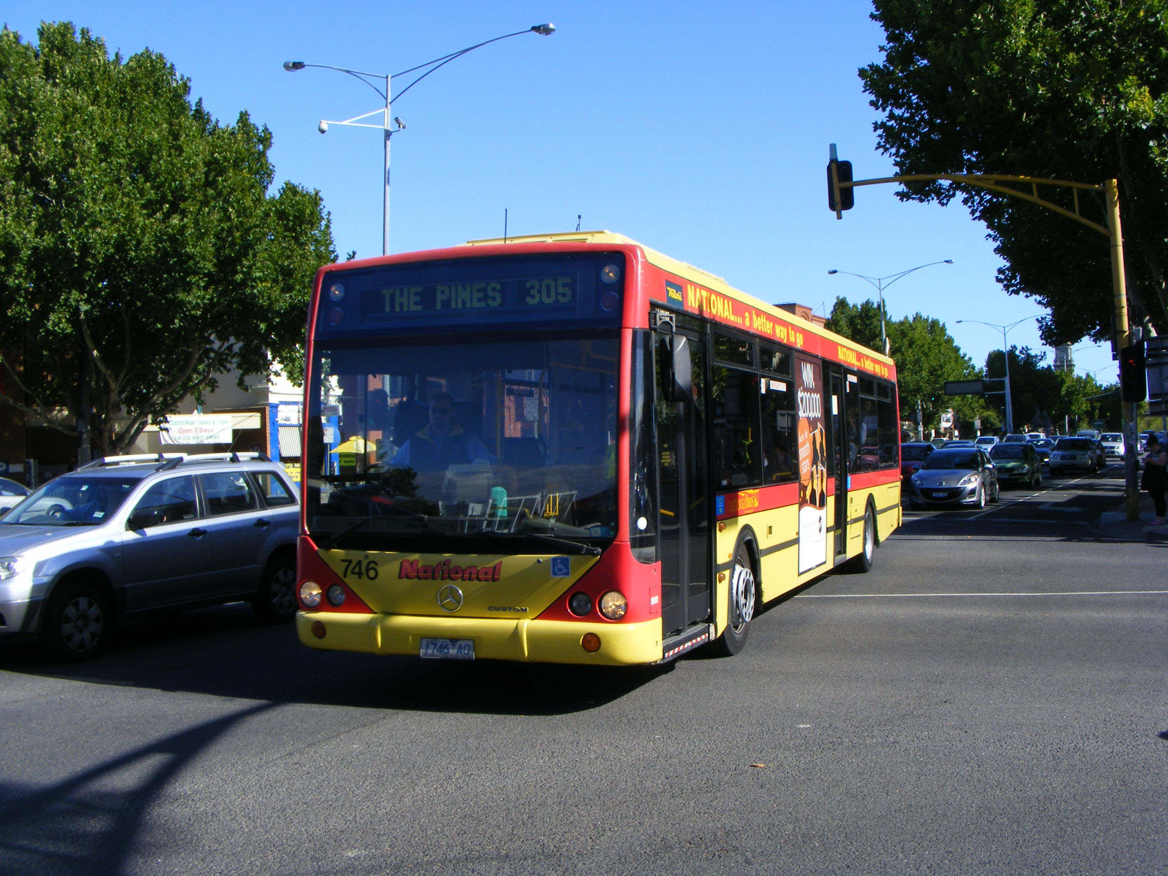 Heading out to The Pines, north of Doncaster, on Hoddle Street, Abbotsford in January 2013 is 746 (1746AO). Note one of the Custom 550 bodied Mercedes repainted in Smartbus livery bringing up the rear. |   |