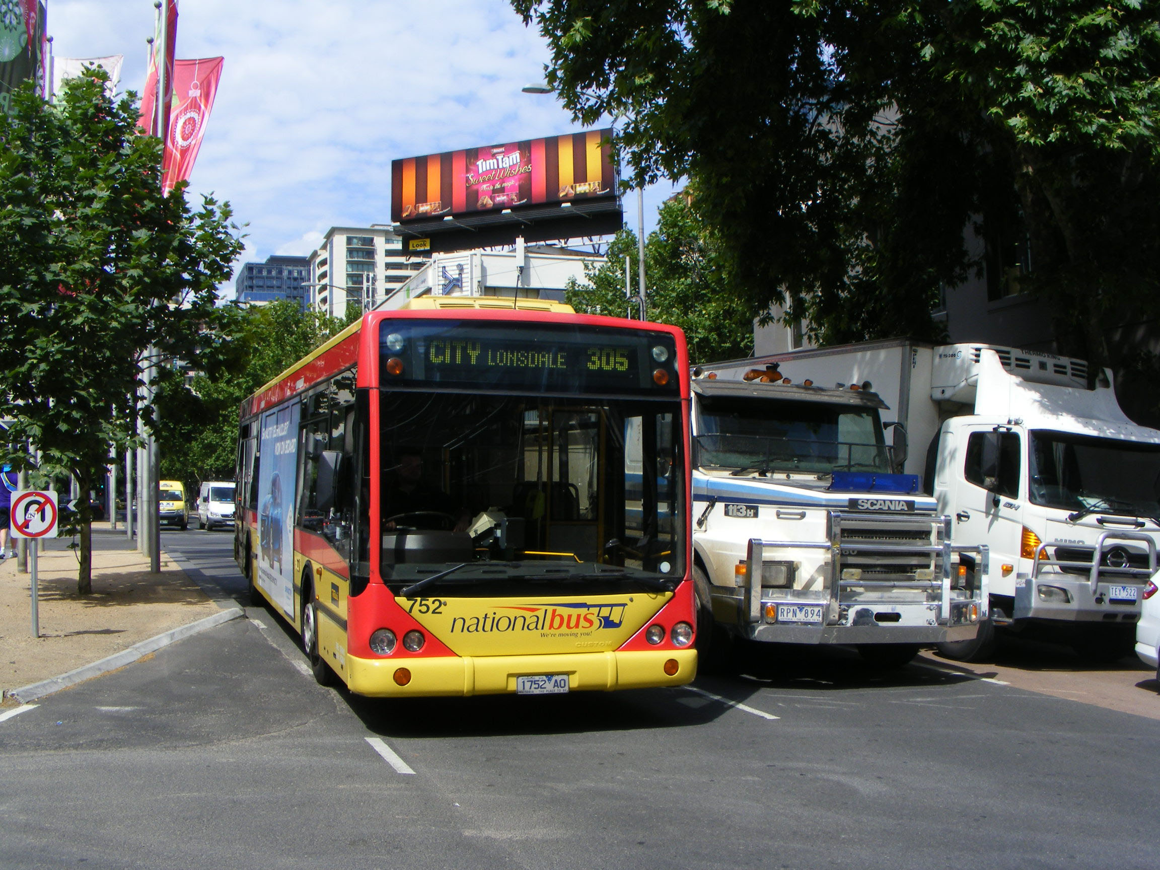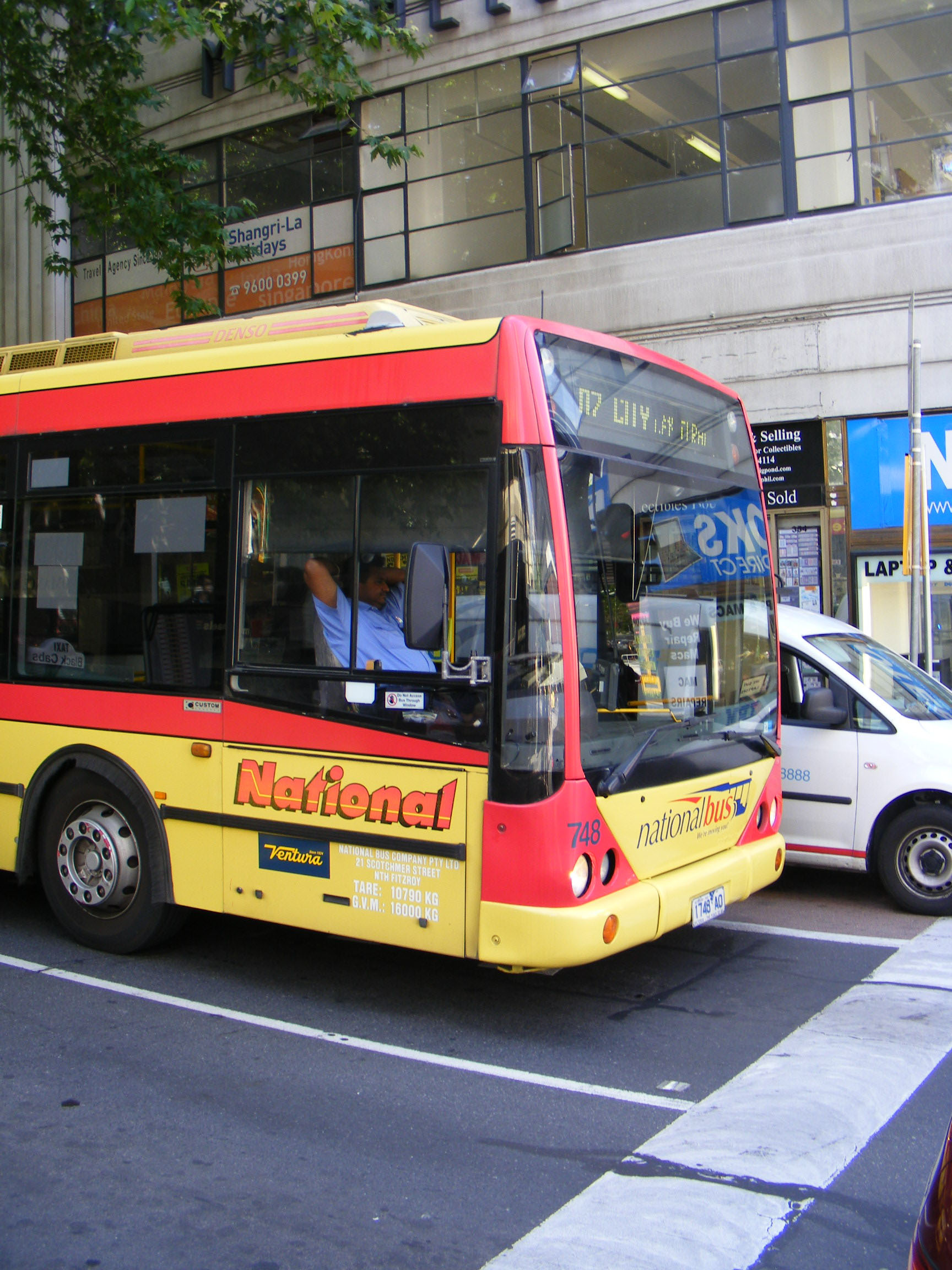 In November 2011, Custom CB60 bodied Mercedes O405NH 748 (1749AO) was displaying the original "National" fleetname, the National Express inspired "National Bus" name, reatined by Ventura for the Melbourne operation and a Ventura fleetname too. Some buses survived in this livery into Transdev ownership and surprisingly were not prioritised for painting into the orange and white PTV colours. |   |