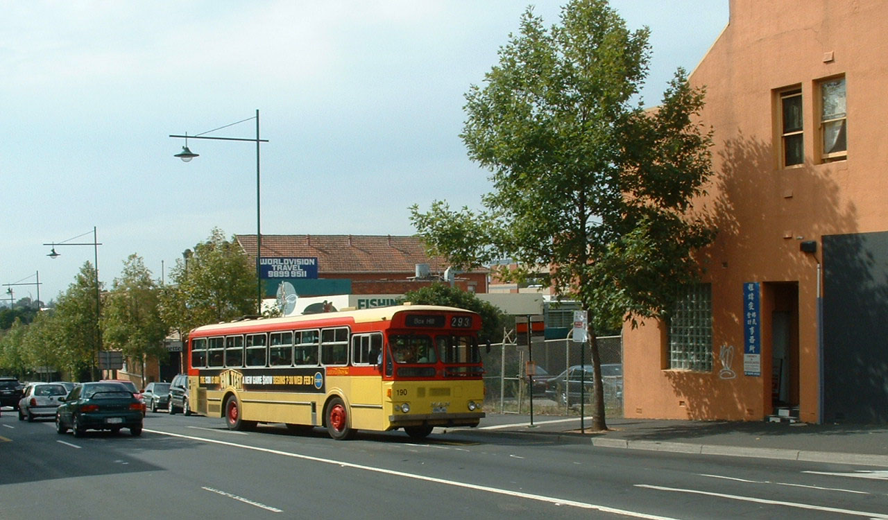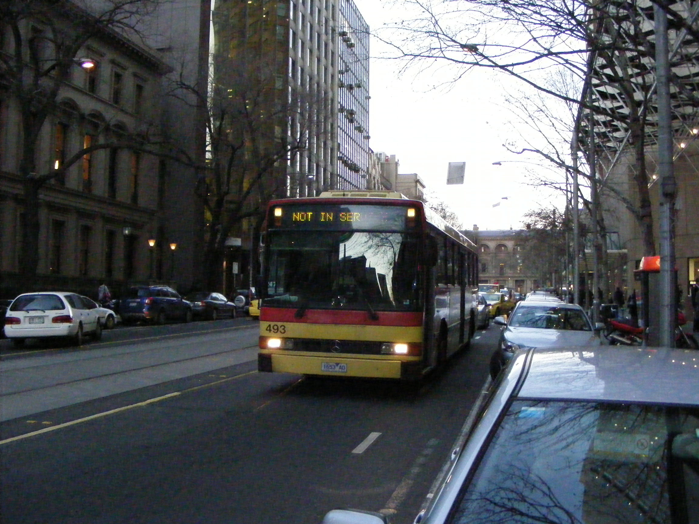The rear of sister vehicle, 498 (1658AO) with the extremely large "LONG VEHICLE" markings on the rear. In 1998 five of these dual door 59 seaters (496-499) were delivered, following a batch of 57 seaters in 1997. The large capacity vehicles were sold to Surfside in Queensland. |   |