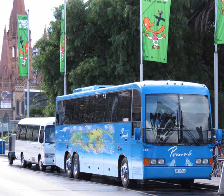 In March 2014 473 was still sporting its special livery seen here opposite Melbourne Arts Centre under flags for the Melbourne Comedy Fesitval.