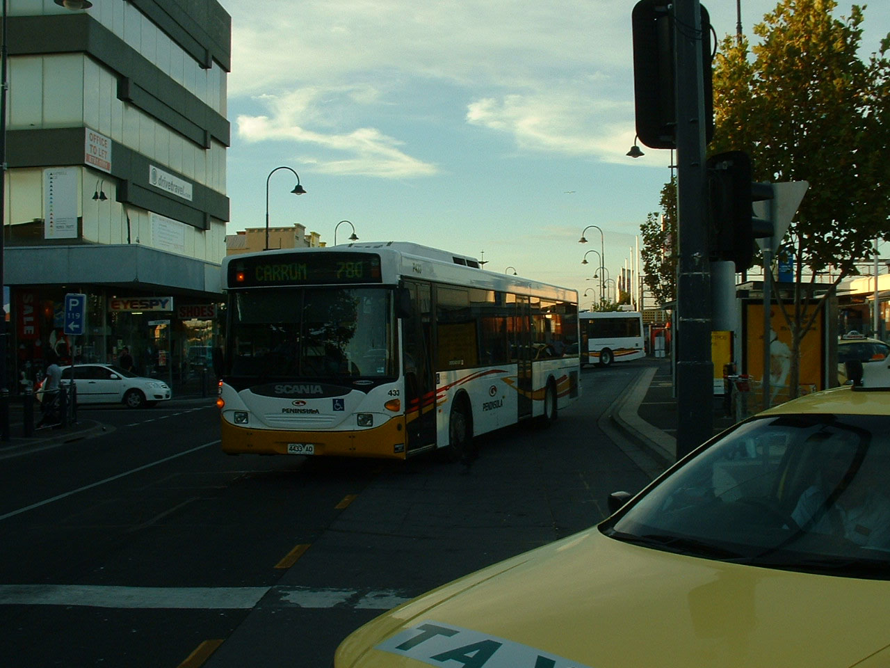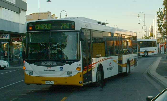 Grenda subsidiaries Peninsula and Portsea come together at Frankston. Portsea shared the blue livery of Peninsula, but in this view of identical Mercedes O500LE buses seen in February 2013, there is little to tell them apart. Subsequently taken over by Ventura even the fleetnames will be the same. On the left is 2006 Peninsula P342 (6100AO) and on the right 2005 Perth built Portsea 329 (5957AO). |