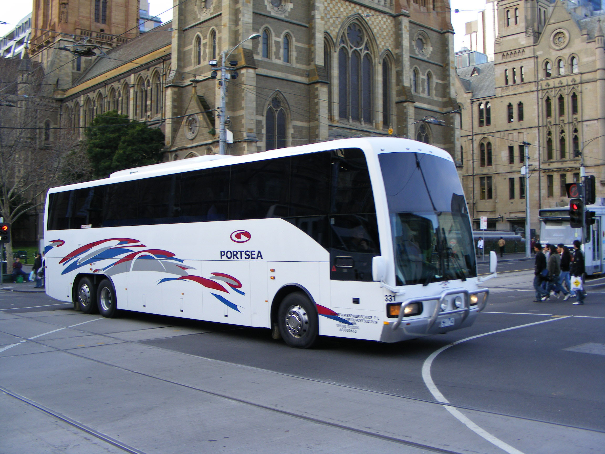 Grenda subsidiaries Peninsula and Portsea come together at Frankston. Portsea shared the blue livery of Peninsula, but in this view of identical Mercedes O500LE buses seen in February 2013, there is little to tell them apart as all Grenda subsidiaries adopted the standard white, red and yellow livery. Subsequent to the take over by Ventura now even the fleetnames are the same. On the left is 2006 Peninsula P342 (6100AO) and on the right 2005 Perth built Portsea PP329 (5957AO). | |||||||