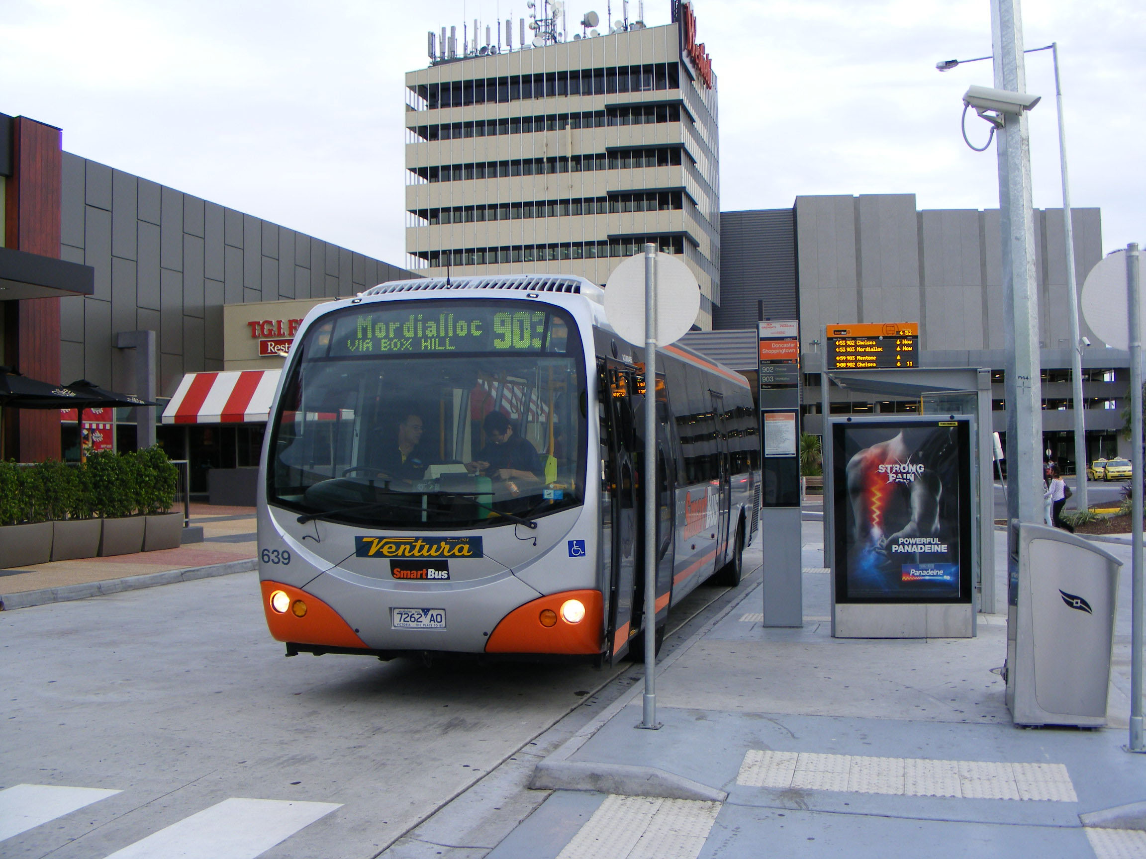 The Melbourne transport authorities supplemented the city's transport system with a network of SmartBus routes. These tendered services fell into two categories and Ventura's MAN 16.240 with New Zealand built Designline bodywork is seen at the heart of the network in Doncaster in April 2010. From the Doncaster environs express routes operate via the Freeway to the city downtown area. MAN 639 (7262AO) is not on one of these routes but one of the outer orbital services linking various townships and shopping centres with the radial train network. Besides the distinctive silver and orange livery the services are characterised by real time displays, a large example of which is seen in Doncaster Bus Station at the Westfield shopping plaza. The routes also feature a variety of bus priority measures. In 2013 Ventura supplied vehicles for almost the whole network and had made an early start at rebranding all Grenda SmartBuses as Ventura. The Doncaster commuter routes had long been dual branded Ventura and National Bus. The orbital routes with end to end journey times of several hours take group vehicles beyond the company's normal areas of operations and involved other Melbourne operators garaging vehicles, for example Tullamarine and Westbus at Altona. ![]() |