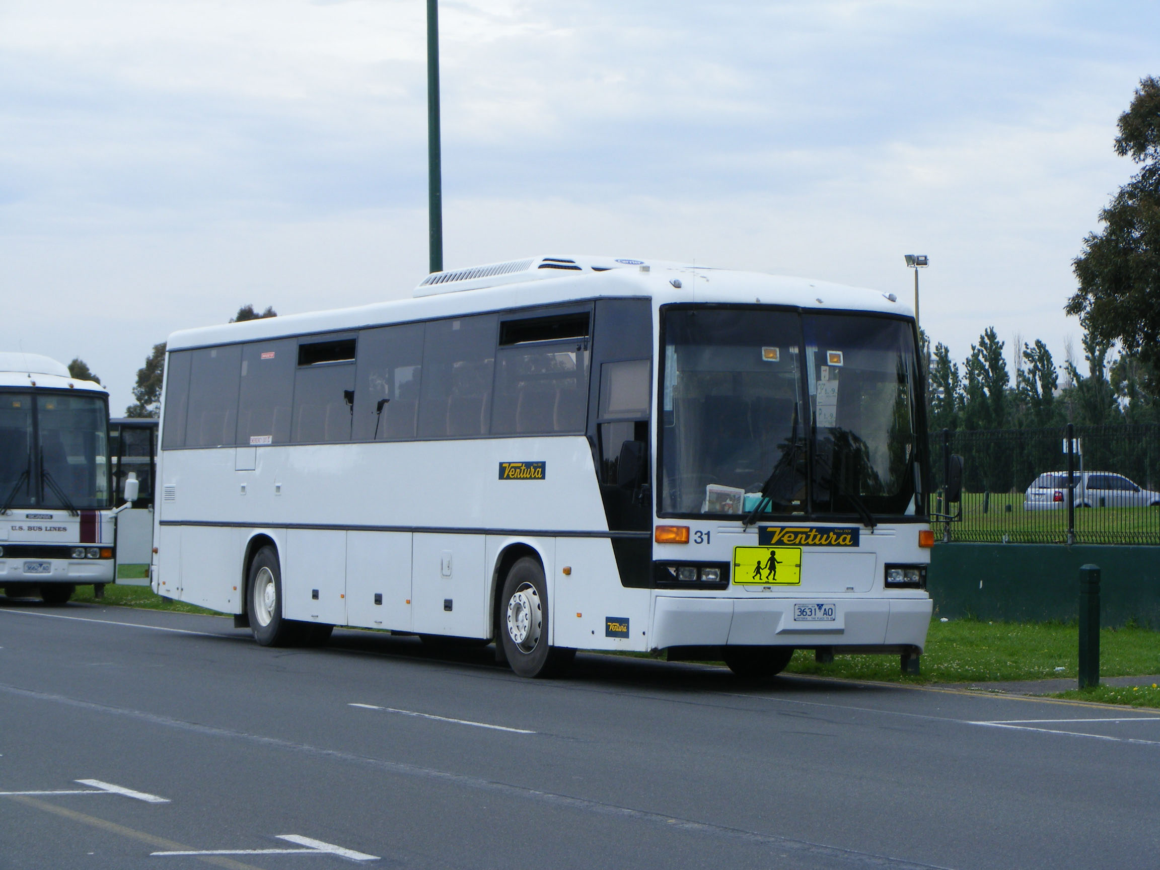 Two contrasting members of the Ventura charter fleet seen at Oakleigh in April 2010 are 117 (2688AO), a 1996 Hino BD186K with PMC's Cadet body and 114 (2676AO) a MAN 16.240 with Custom body dating from 1993 but new to Mount Dandenong as 50 (FFM774). |