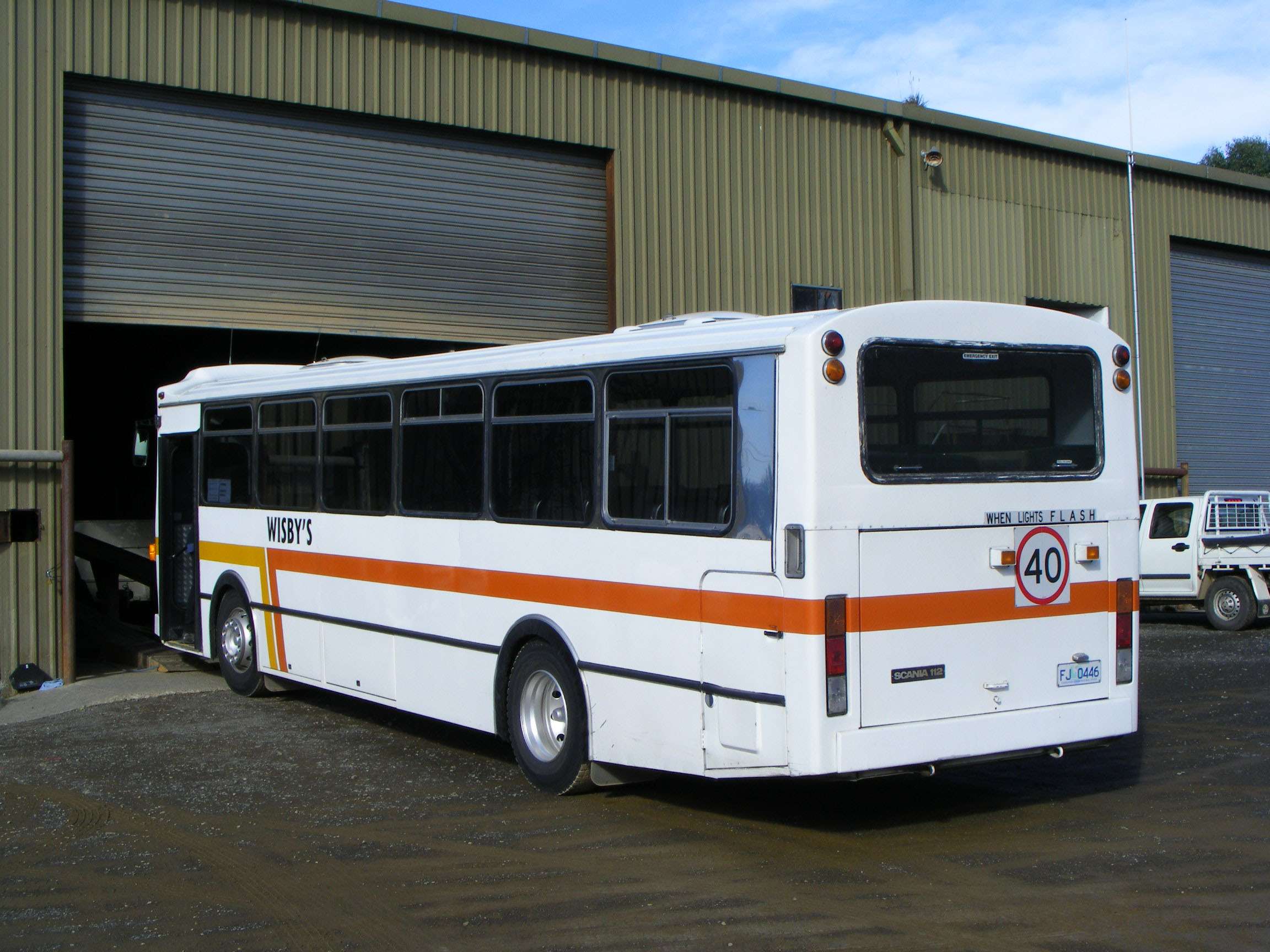 Scania FJ0446 backs out of the maintenance sheds. The bus was MTT 104 (MET104), a 1988 N112CRB with Ansair Tasmania body. |
