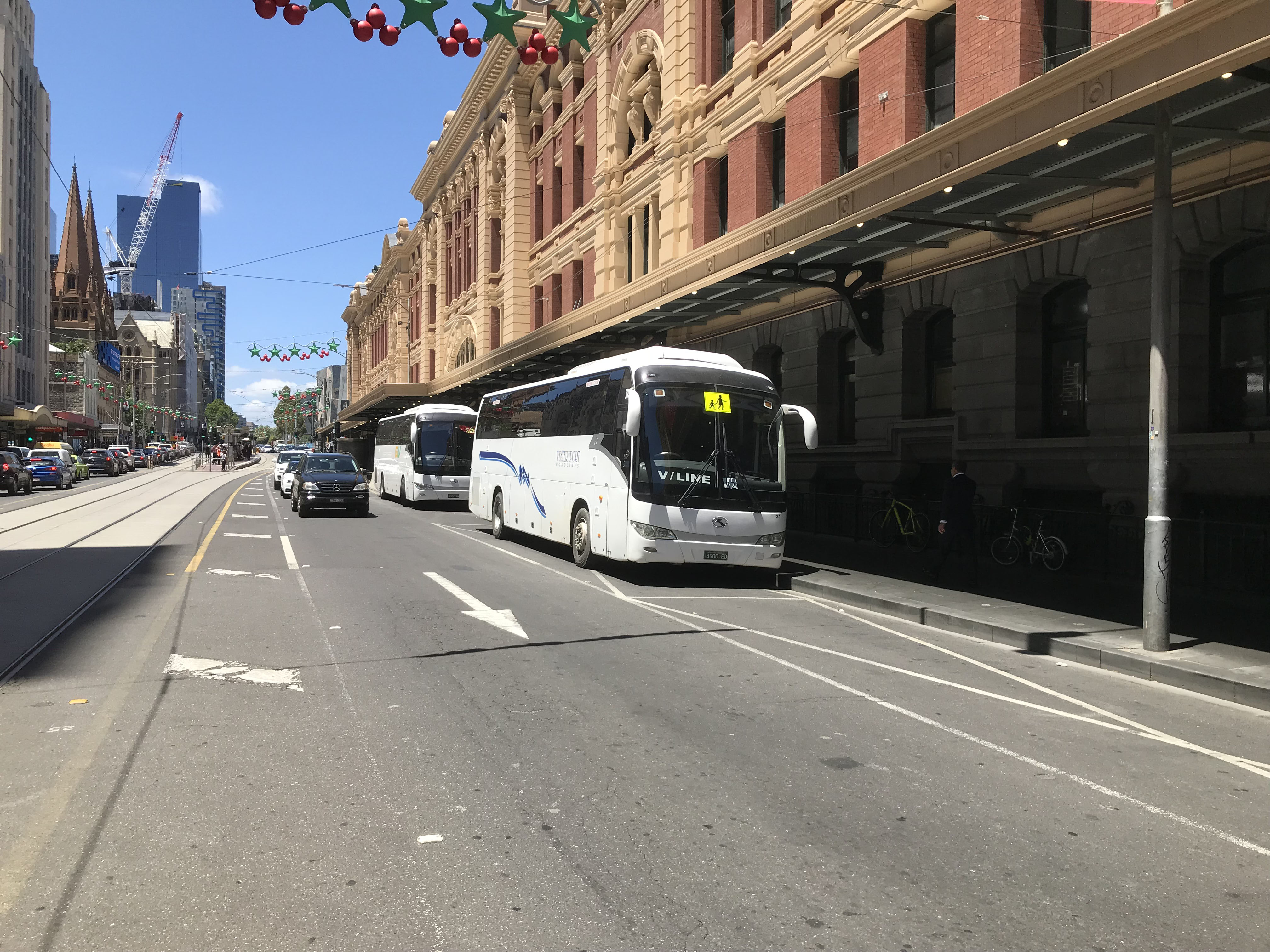 Irizar Century bodied Scania K380IB 68 (7375AO) is seen at Dandenong Station in January 2019, doubtless on V-Line duties. The coach was new to Moreland for Greyhound Australia work.