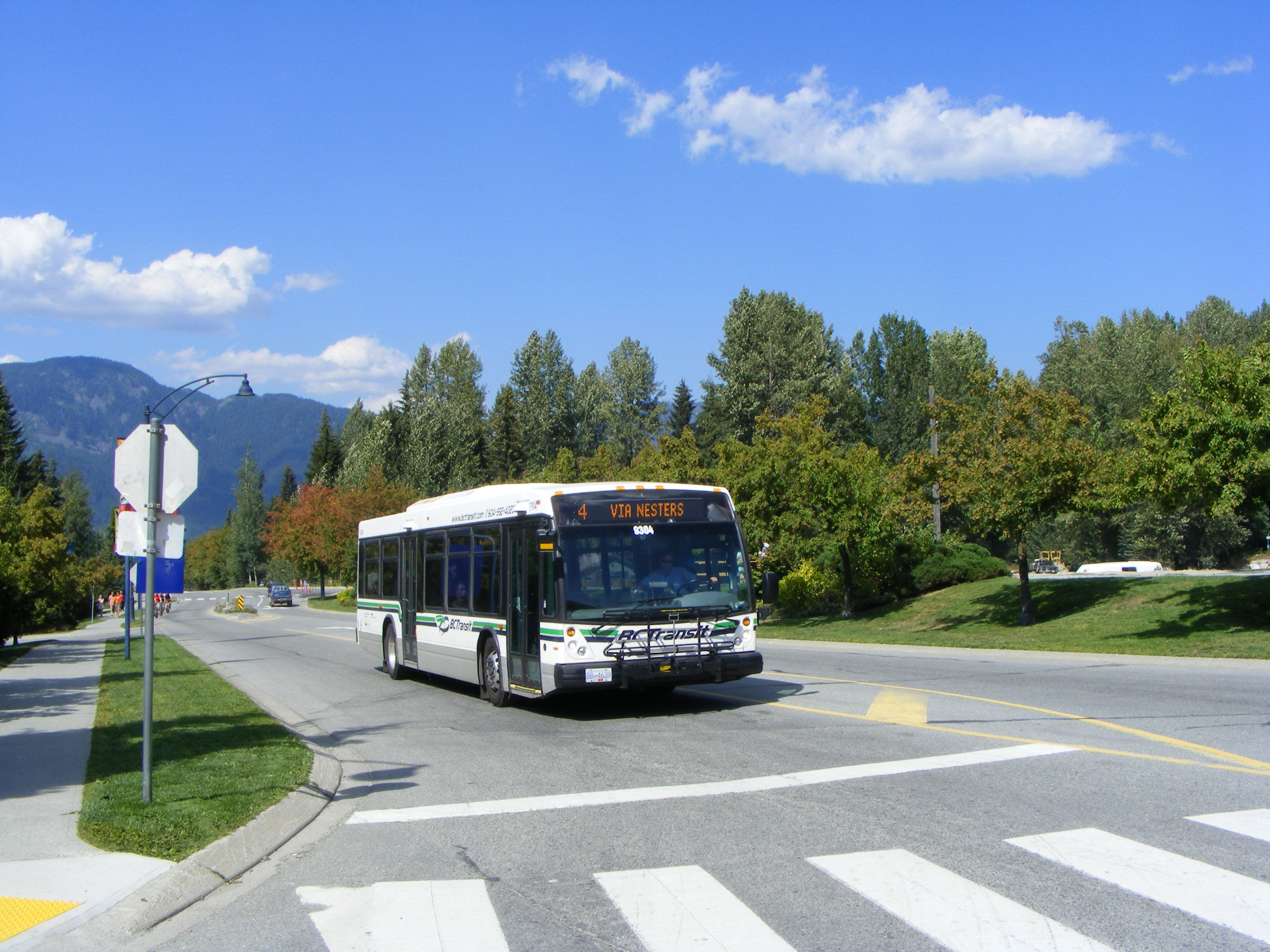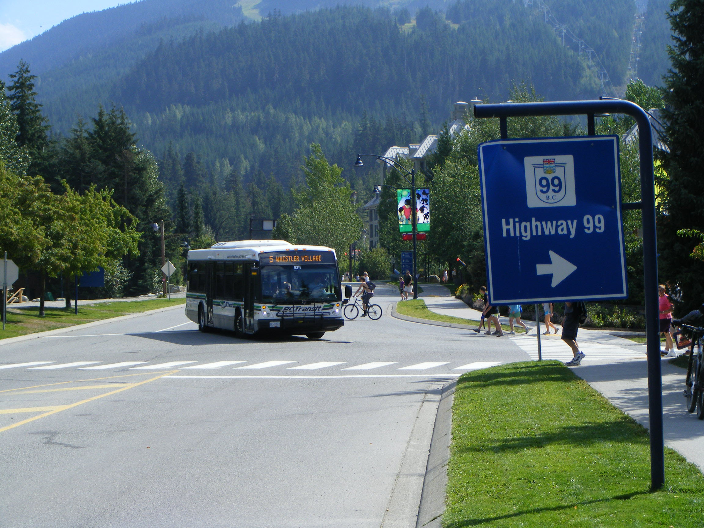 Managing two bikes NovaBus 9312 heads for the Ski Village. The bikes might be for use on the ski runs as, in the absence of snow in the summer season, some of the ski runs are given over to bikes.