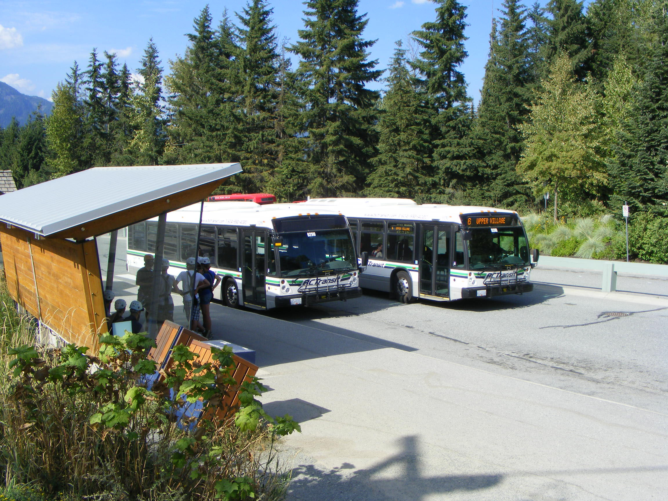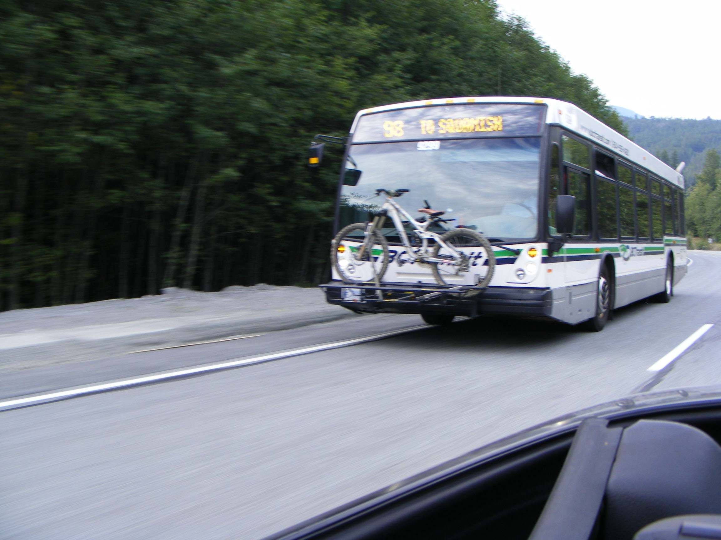 The road from Vancouver north to Whistler has stunning scenery with lakes, mountains and the sea. It is known as the Sea-to-Sky Highway. Work was hurriedly being completed to upgrade the Highway to dual carriageway throughout in readiness for the Winter Olympics. NovaBus 9299 was heading south down the Highway to Squamish.
