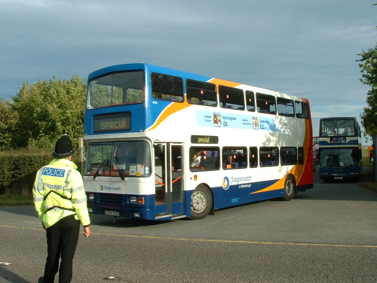 Seen leaving SHOWBUS 2004 is Alexander bodied Volvo Olympian 16592 (S592BCE) branded fro Stagecoach in Peterborough.