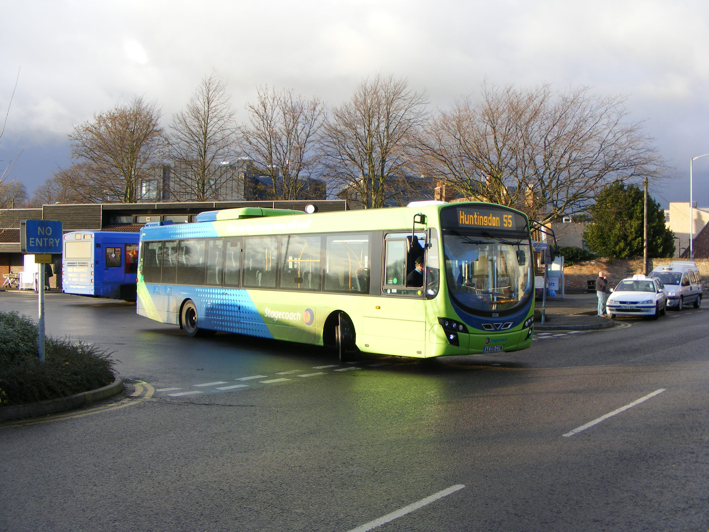 Before consolidating its operations as Stagecoach East the company traded as Stagecoach in Peterborough and Stagecoach in Cambridge, but operations acquired with Huntingdon & District traded as Stagecoach in the Fens. Their Huntingdon depot was well placed to feed buses on to the Busway and into Cambridge. Seen in September 2009 this diesel powered Volvo B7RLE is seen in Huntingdon Bus Station in standard Busway livery. |