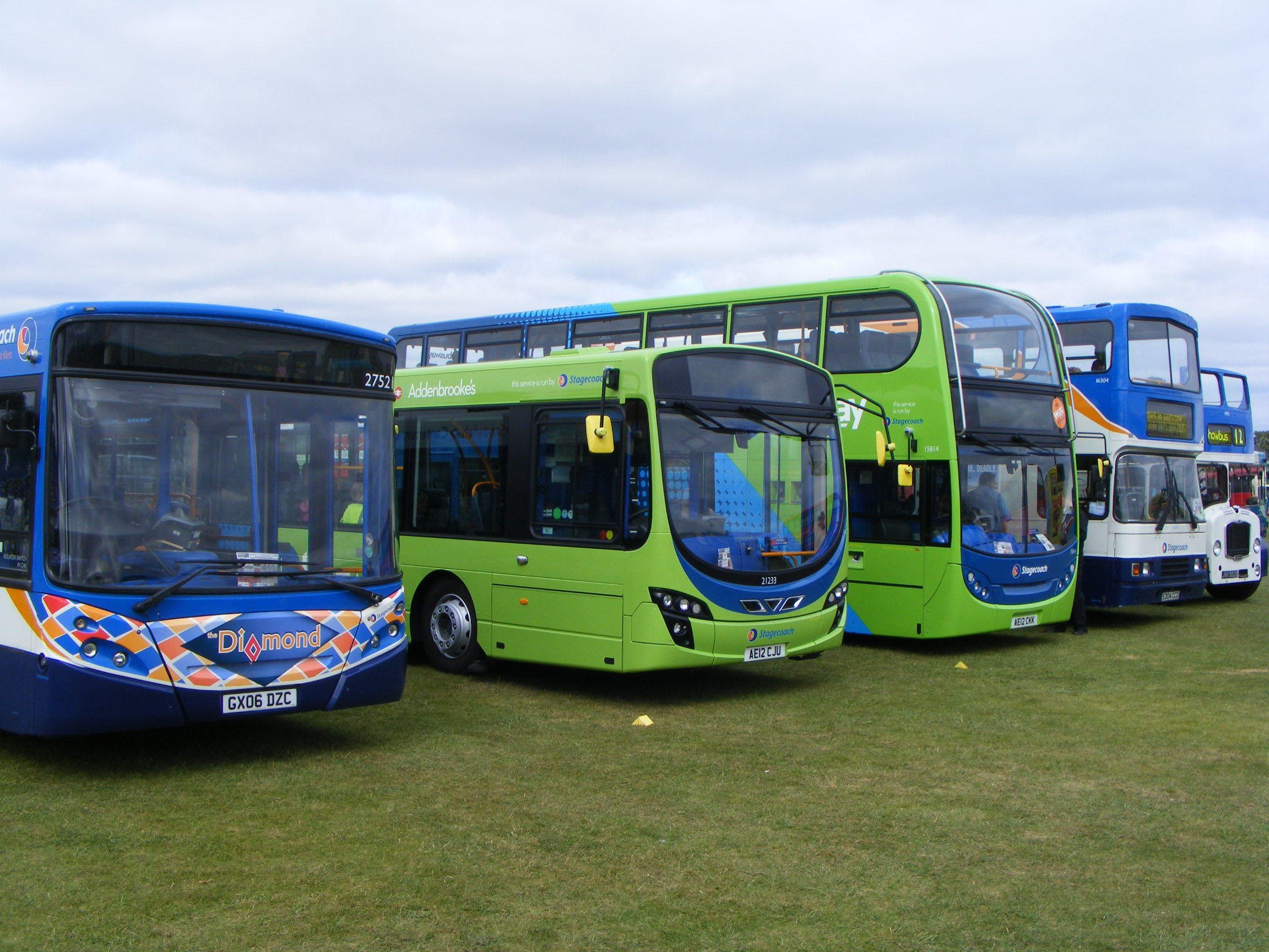 This is the Stagecoach line up at SHOWBUS international 2012, the Busway having opened the previous year two new Busway vehicles were on display in the green and blue colours, Volvo B7RLE 21233 (AE12CJU) and Scania N230UD 15814 (AE12CKK) they are joined by East Kent Alexander Dennis Enviro300 27521 (GX06DZC) with Diamond branding, Alexander bodied Volvo Olympian 16304 (S304CCD) of Stagecoach South with stalwart open top Lodekka FLF 19952 (JAH552D) on the end. |