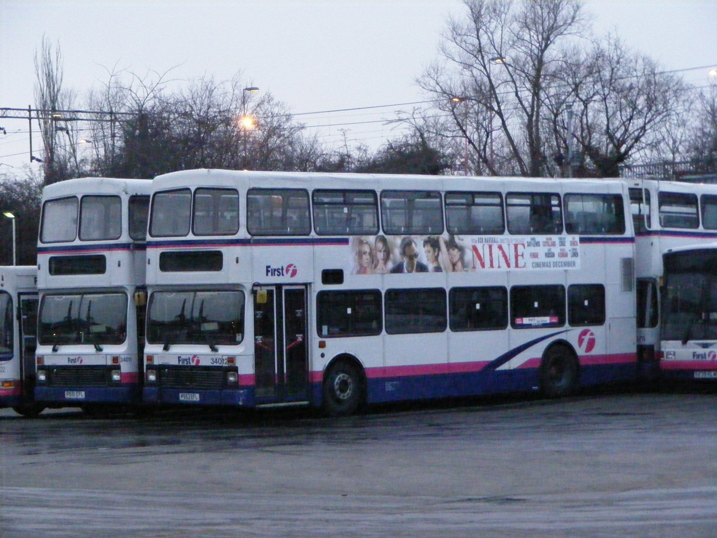 A pair of former Stagecoach Cambus Northern Counties bodied Volvo Olympians, 34011/34012 (P551/552EFL) are seen parked up in the First Essex Basildon depot in February 2010. |