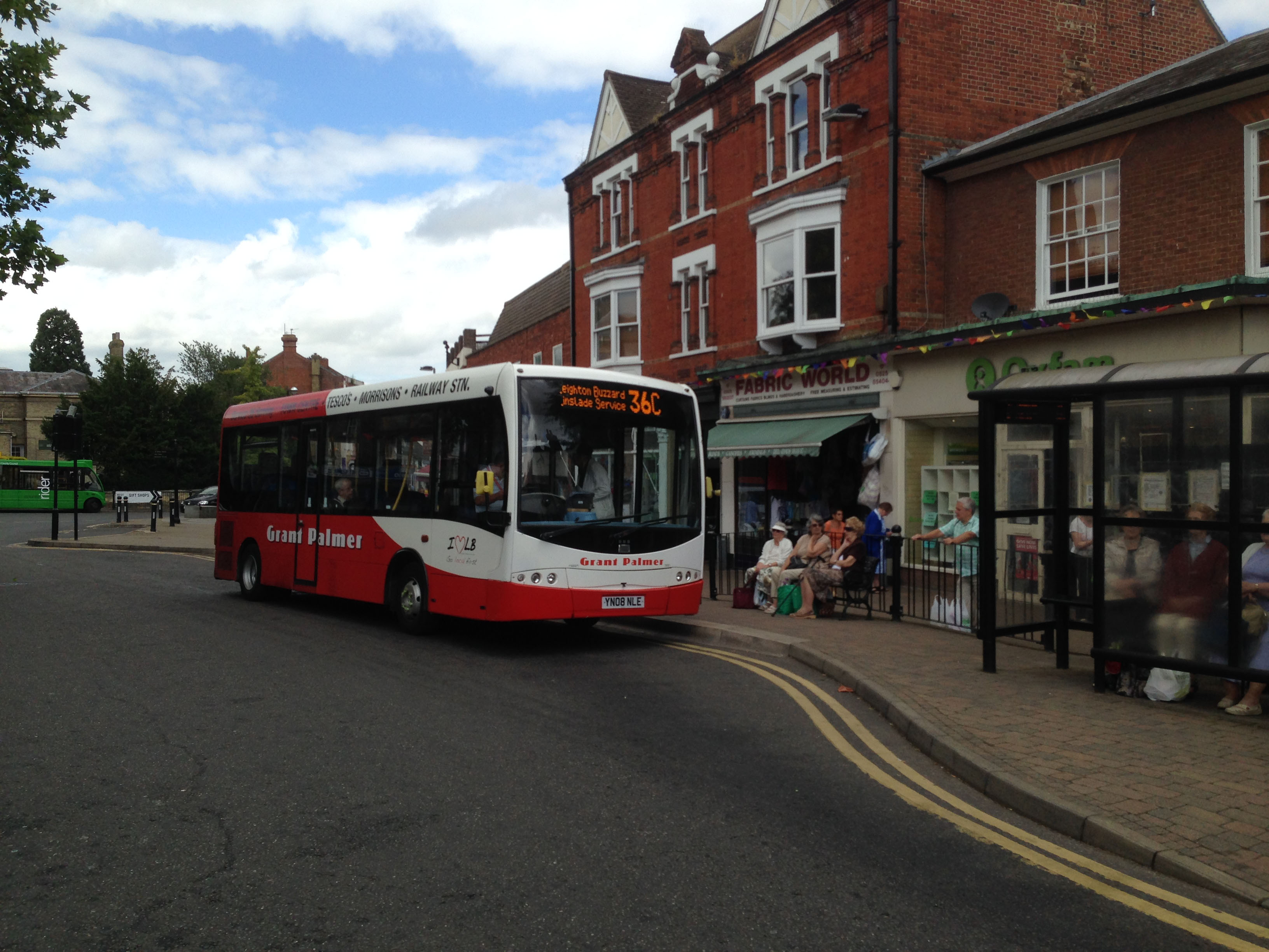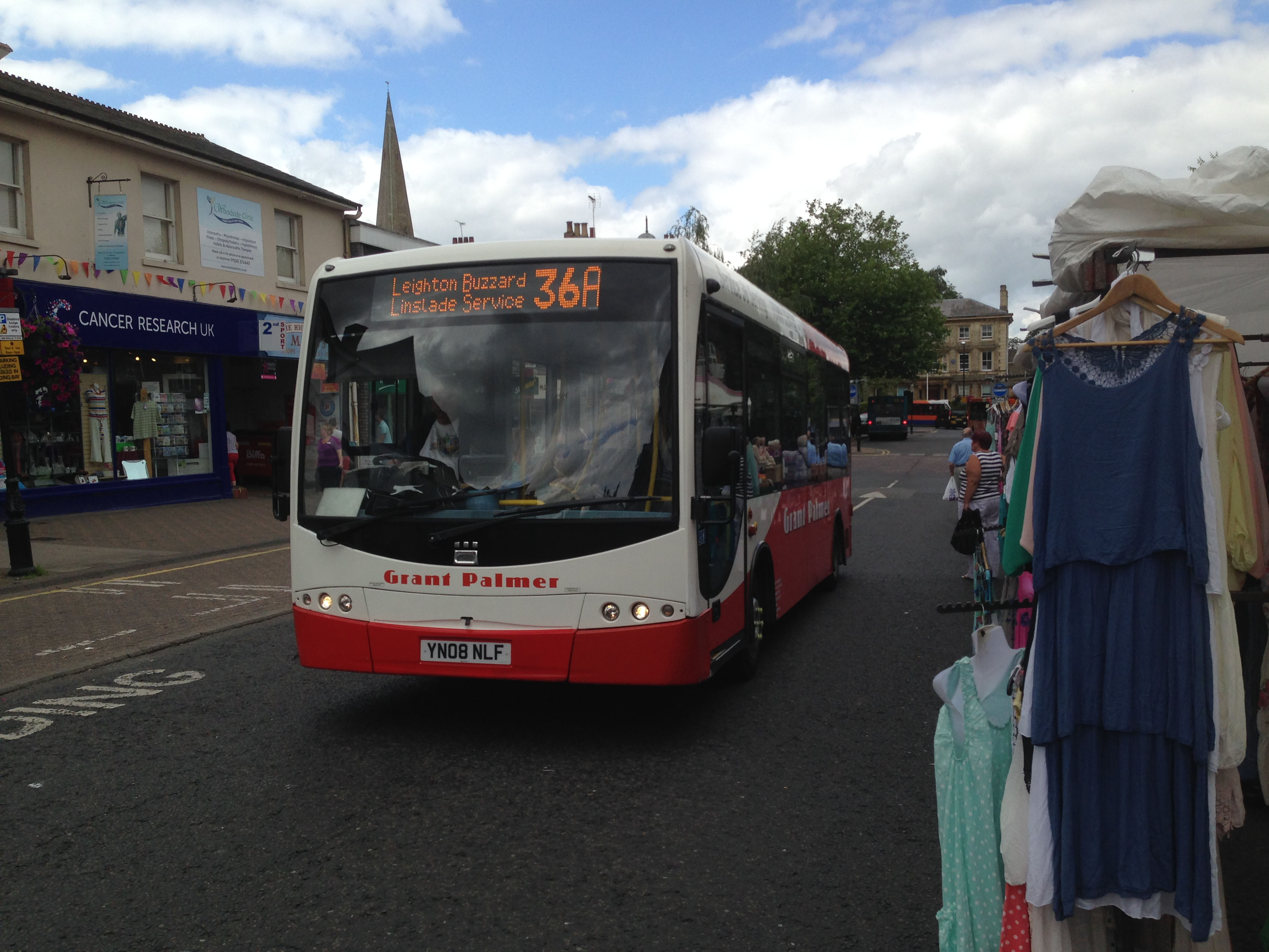 In 2008 Grant Palmer took delivery of a pair of Plaxton's Primo minibuses. Primo 108 (YN08NLE) is seen in July 2014 at work in Leighton Buzzard branded for the town service.