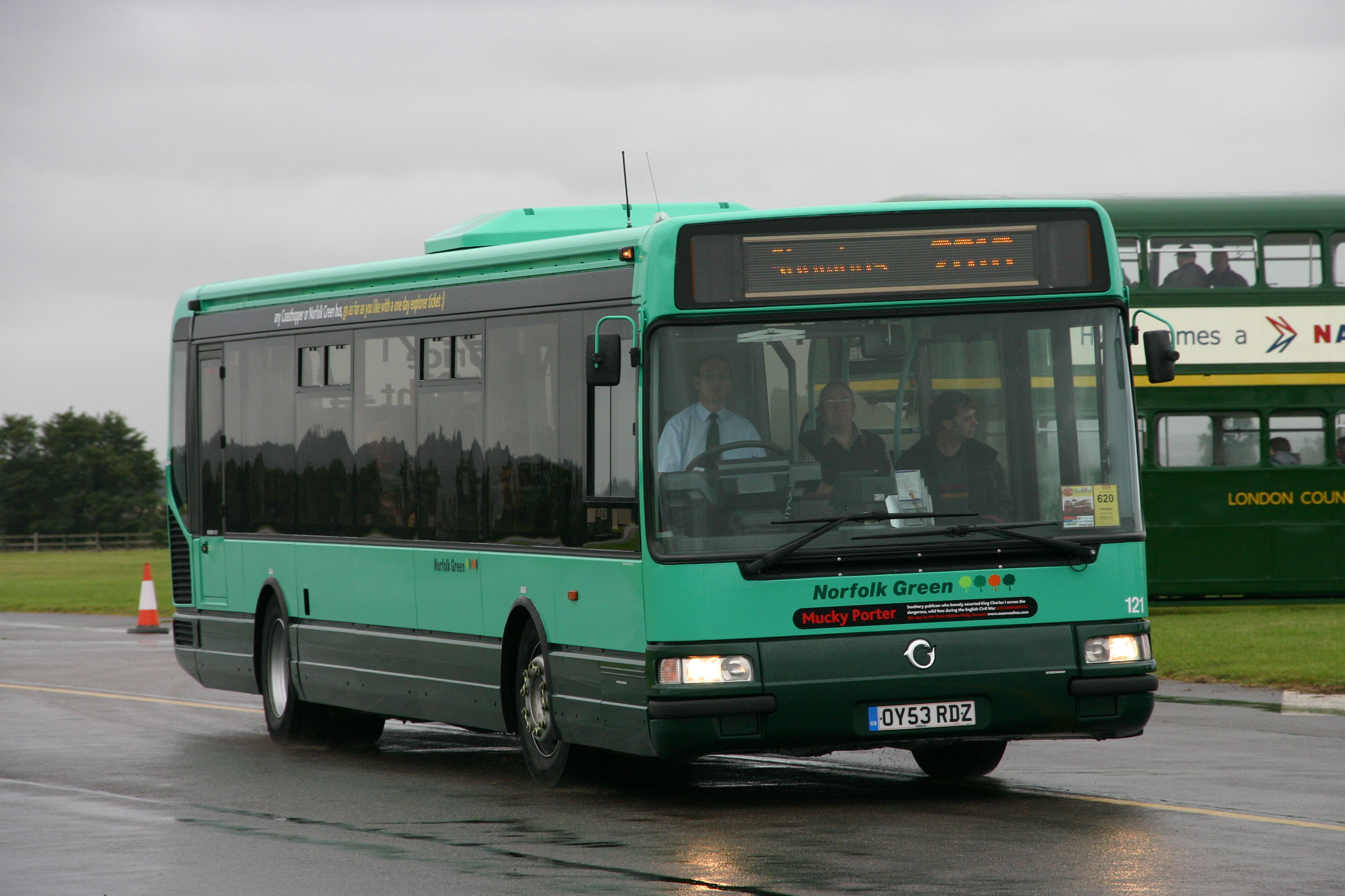 The bus, now 121, is seen later in the day, on display in the arena alongside Cedric's former Wilts & Dorset Optare Spectra, 1615 (M137KRU). |
