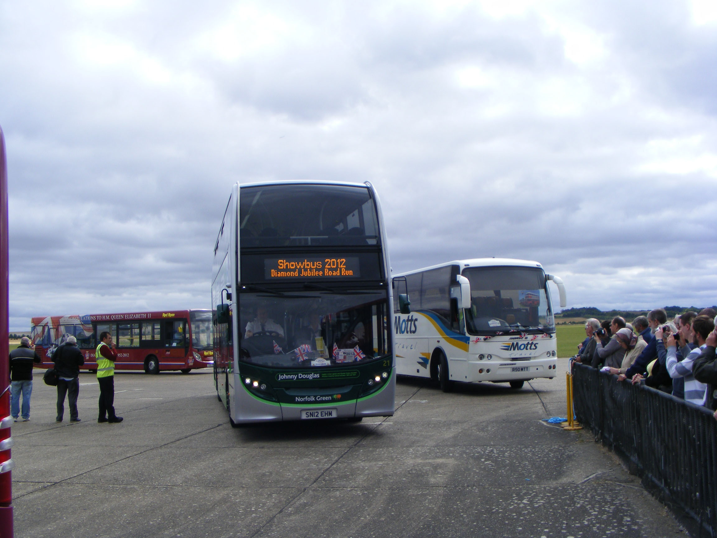 The road run participants paraded the length of the runway before taking up their positions in the afternoon display. Here the Enviro400 is entering the display arena sandwiched between the Motts Travel supprt coach, Jonckheere bodied Volvo B10M R50MTT and Red Rose's Diamond Jubilee liveried Enviro200, YX08HBZ, with crowds of enthusiasts watching on with cameras poised. |
