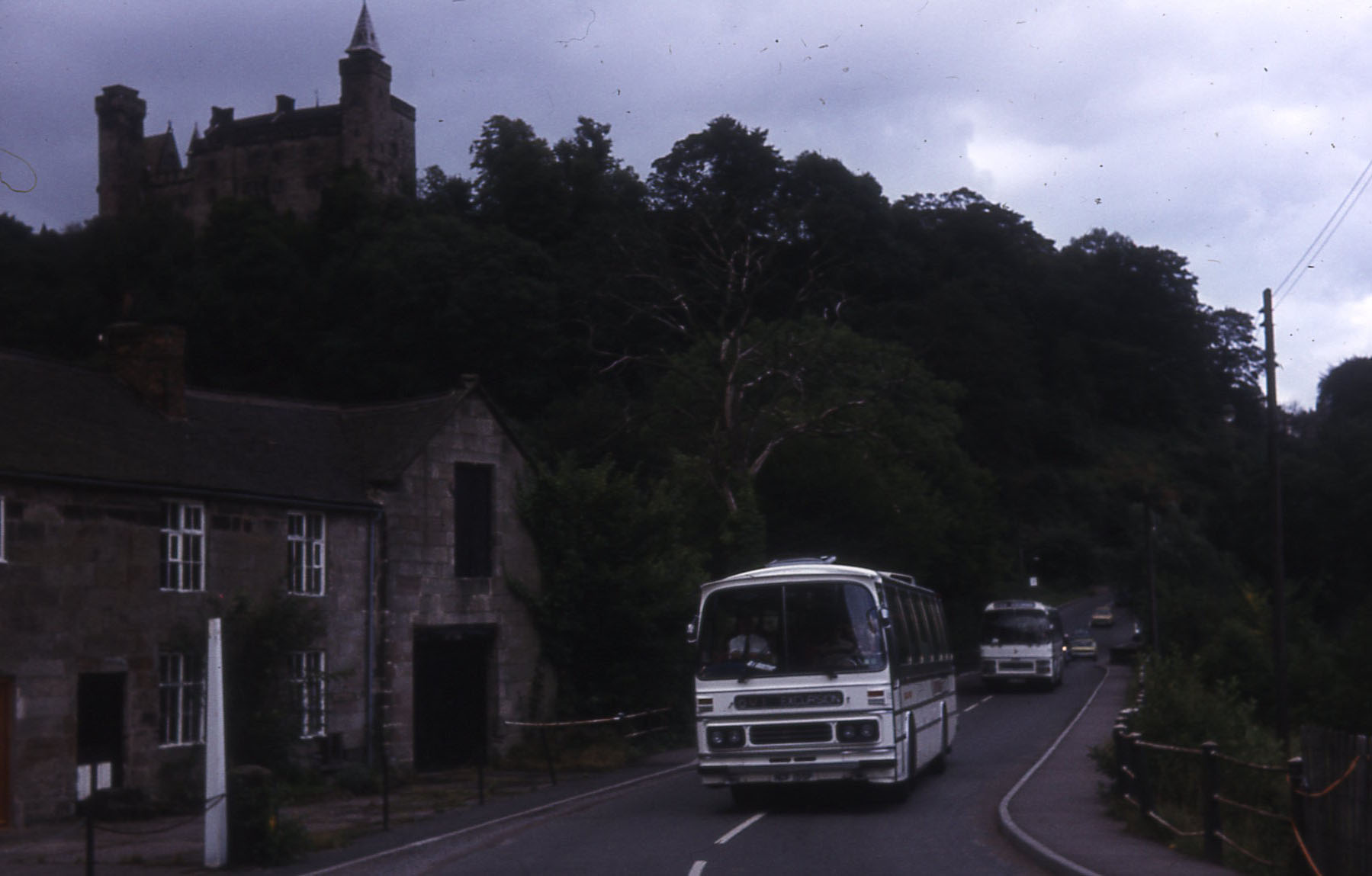 The first iteration of National Express livery is seen on this Plaxton Panorama Elite, probably on a Leyland Leopard chassis, seen at Southend around 1980. The word "EXPRESS" has yet to make an appearance nor the large red fleetname over the front wheel arch advising the operating company. Initial names were in much small lettering underlined in an appropriate colour, in this case black for Black & White. |