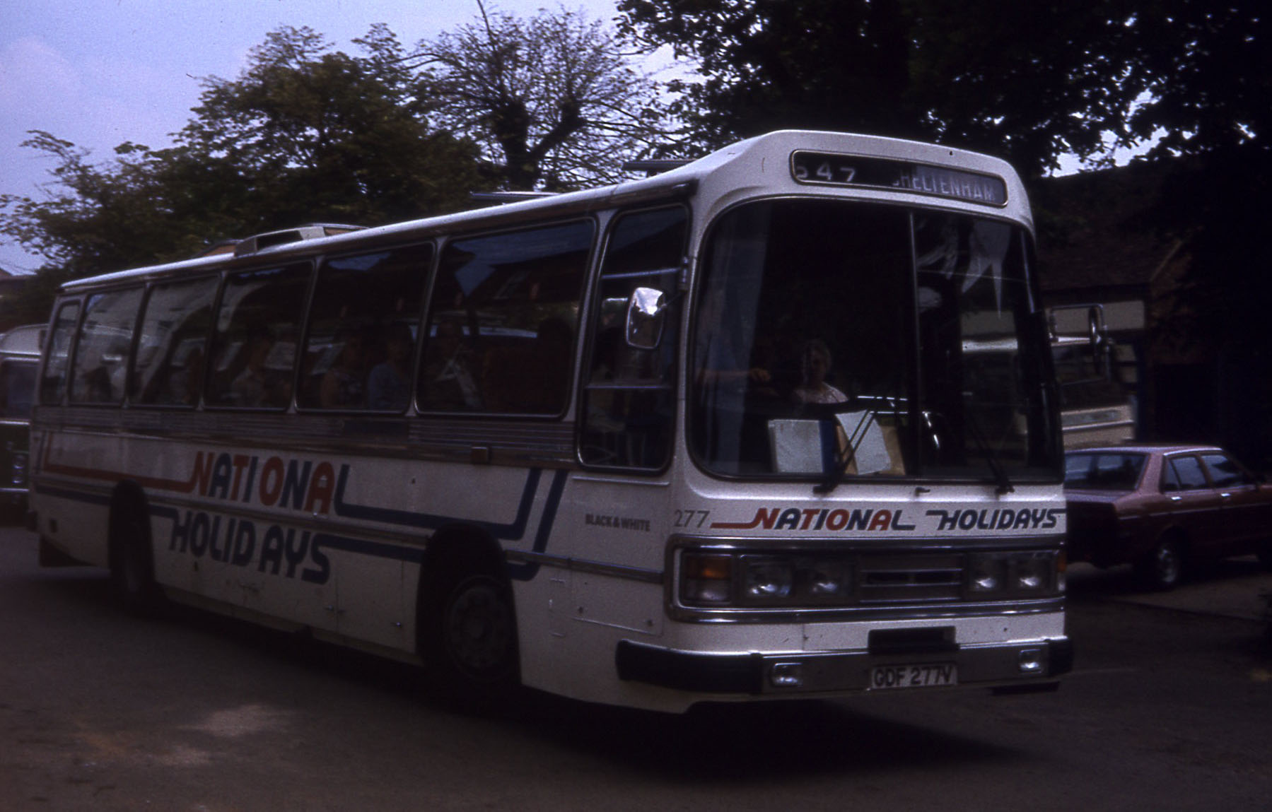 Prior to nationalisation, Black & White is not thought to have been involved in holiday tours but this Duple Dominant bodied Leyland Leopard, 277 (SDD146R) is in National Holidays colours, though the blind suggests it is on an express service to Cheltenham. The coach was later transferred to Kentish Bus and used in full livery on Green Line services as 224 before passing to then fellow Proudmutual subsidiary, Northumbria as their 238. |