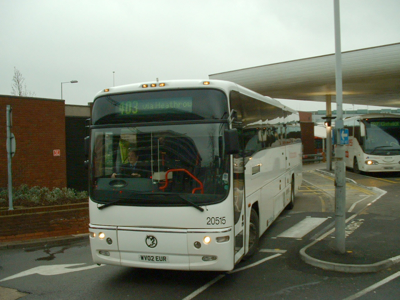 New as First Bristol 2571, now 20515 (WV02EUR), this similar Volvo B12M is seen leaving Heathrow Coach Station in February 2006 bereft of any identification, doubtless pending the application of the new "stair rod" National Express livery. |