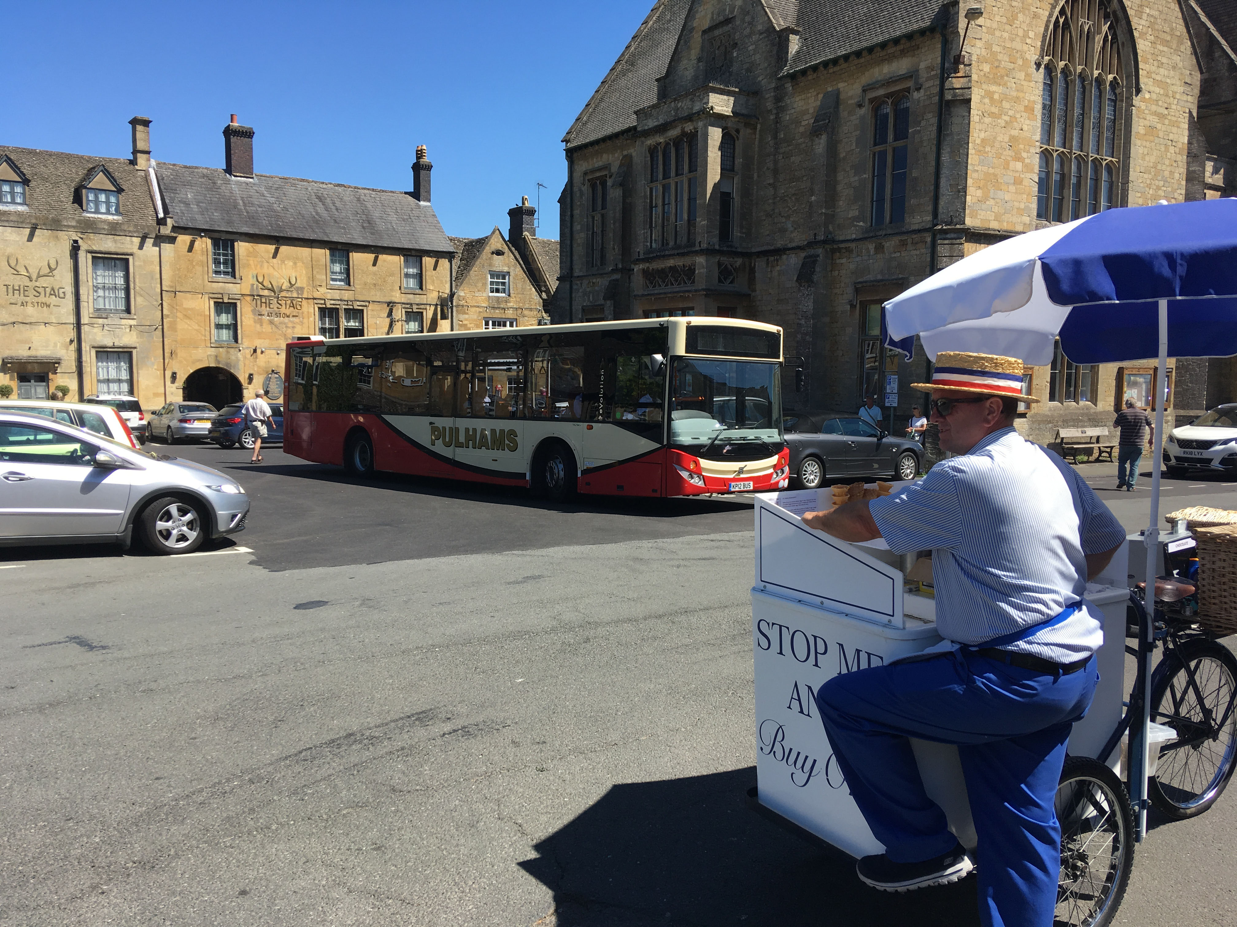 A beautiful Summer's day in Stow-on-the-Wold in August 2021 sees MCV Evolution bodied Volvo B7RLE, KP12BUS on layver. Perhaps the driver went for an ice cream?