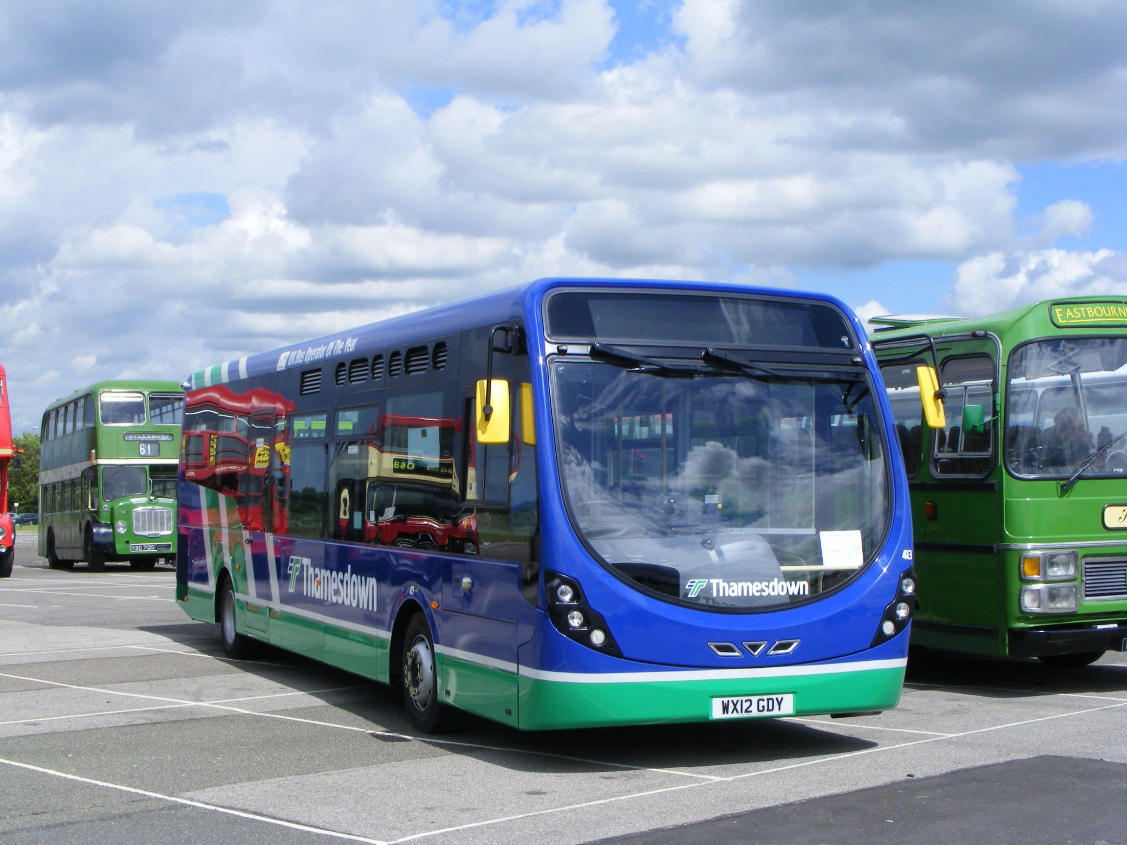 Former Bournemouth Yellow Buses 455 (M455LLJ), an East Lancs bodied Dennis Dart, was acquired by The Big Lemon and clearly needed no change in fleet colour. Two other buses from the same batch joined it in Brighton. Now numbered 42 it is seen alongside Thamesdown's Optare Versa 402 (WX60EEA) at the 2011 Maidstone & District centenary rally in April that year. ![]() |