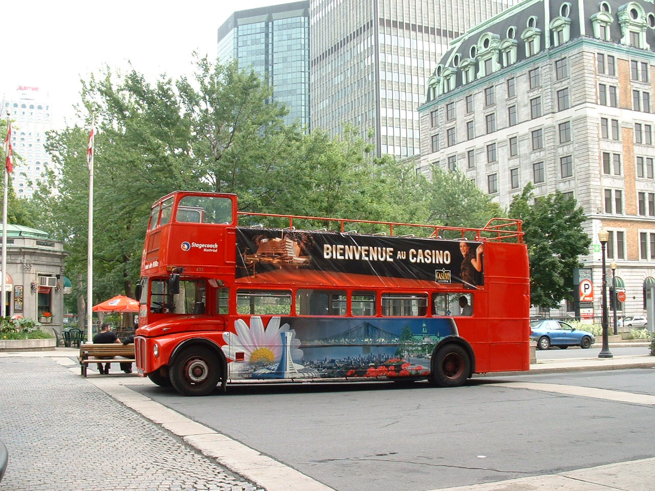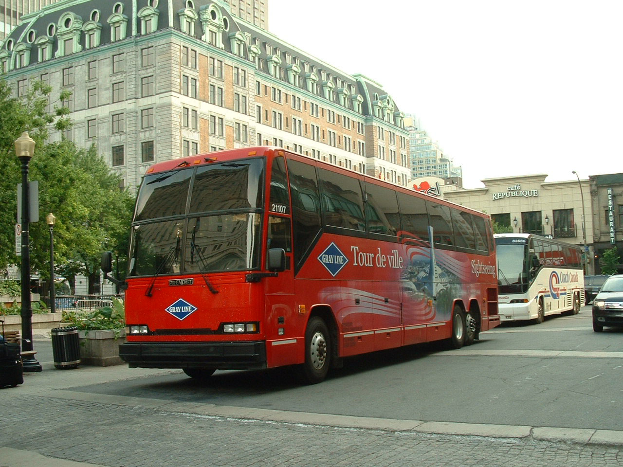 This Prevost wears the insignia of the Routemasters for the city tour. Whilst bearing the Gray Line insignia, that is a franchise operation conducted here by Stagecoach Montreal/Coach Canada. The coach bears Coach Canada/Coach USA fleet number 21107.