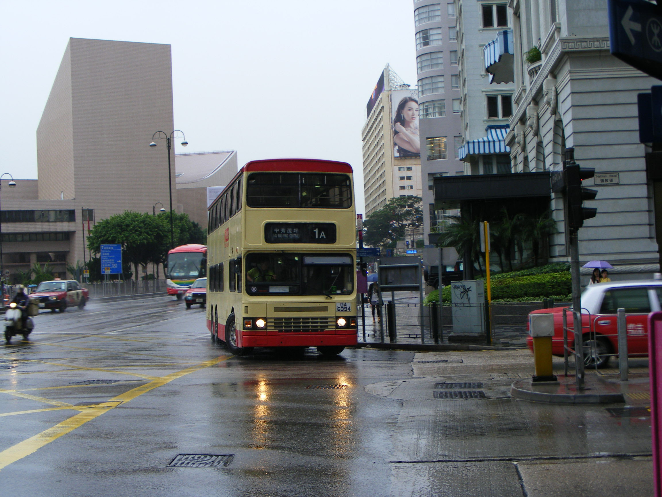 A Marlboro ad KMB triaxle Leyland Olympian, S3BL114, pauses on the tram tracks at a pedestrian crossing as a CMB Fleetline heads in the opposite direction. |