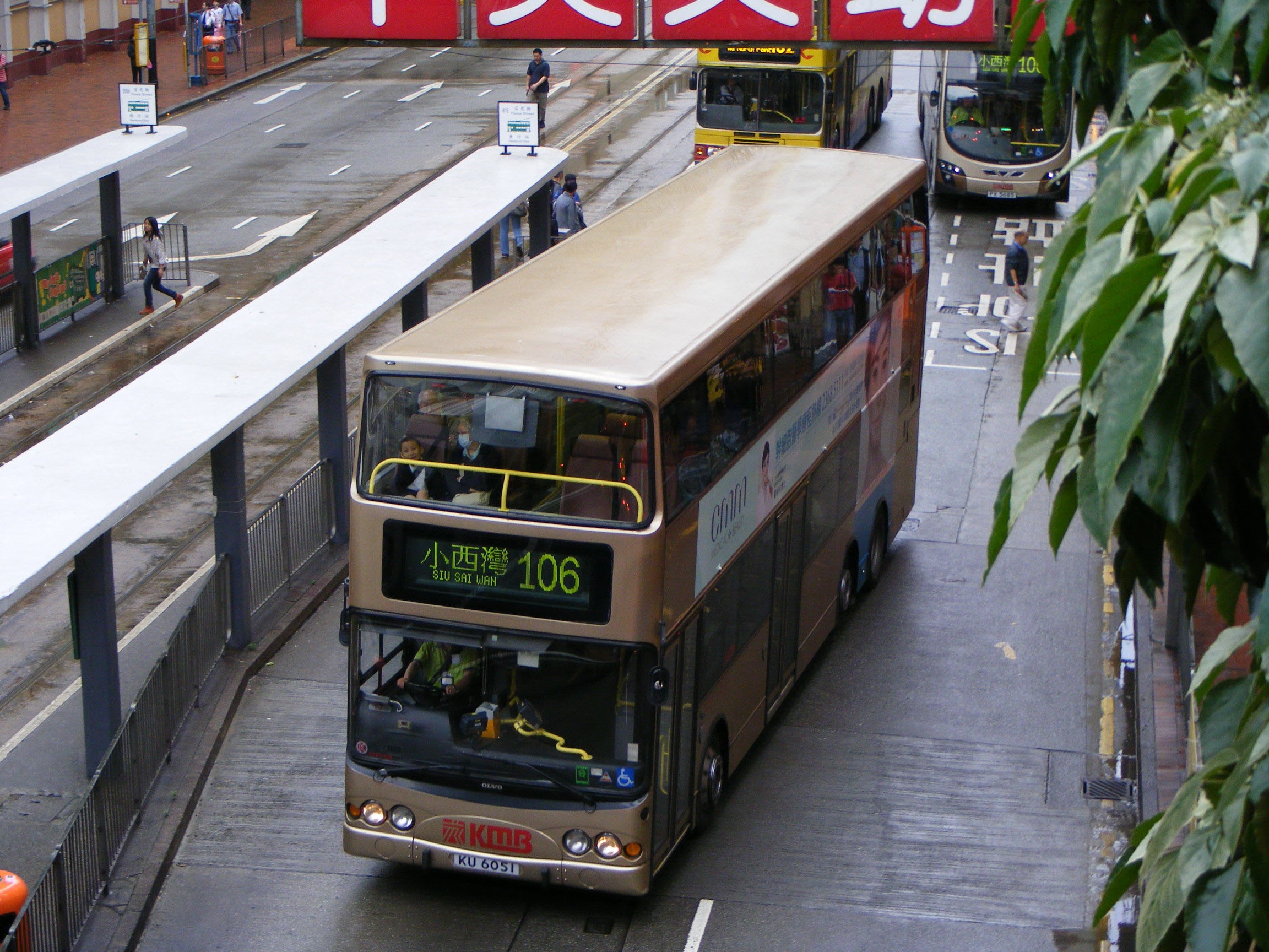 In April 2012 Volgren bodied Volvo B10TL 3ASV470 (KU6051) is seen from one of the many footbridges on Hong Kong Island, designed to separate pedestrians from the chaotic traffic below.