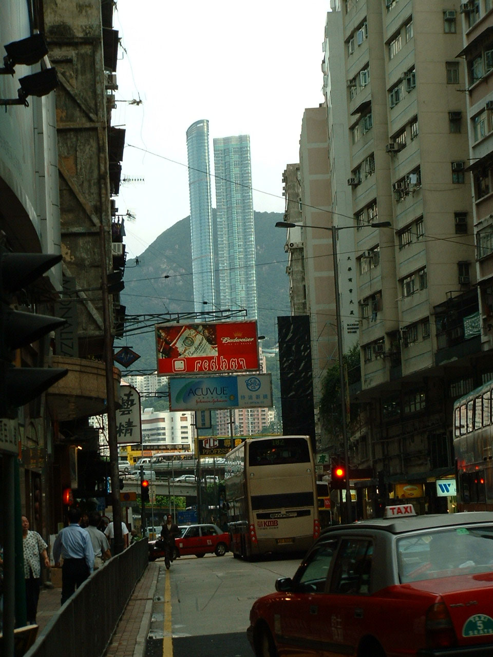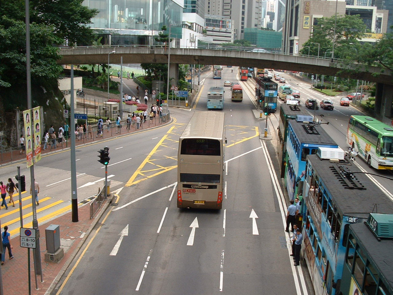 The rear of the Enviro500 here is more incidental to the dramatic skyscrapers, in whose general direction the bus is headed. The towers contrast with the older buildings in the street where the Enviro is travelling.