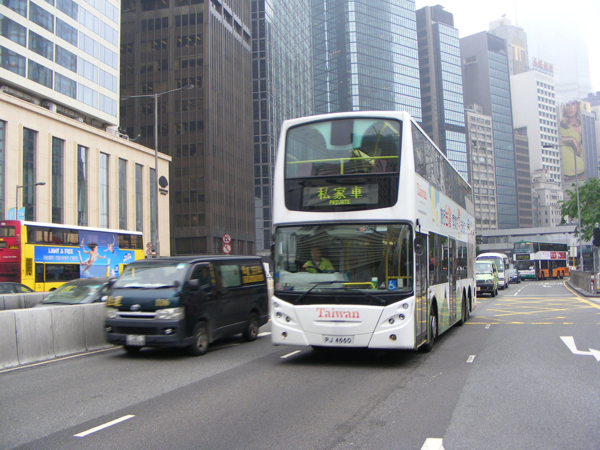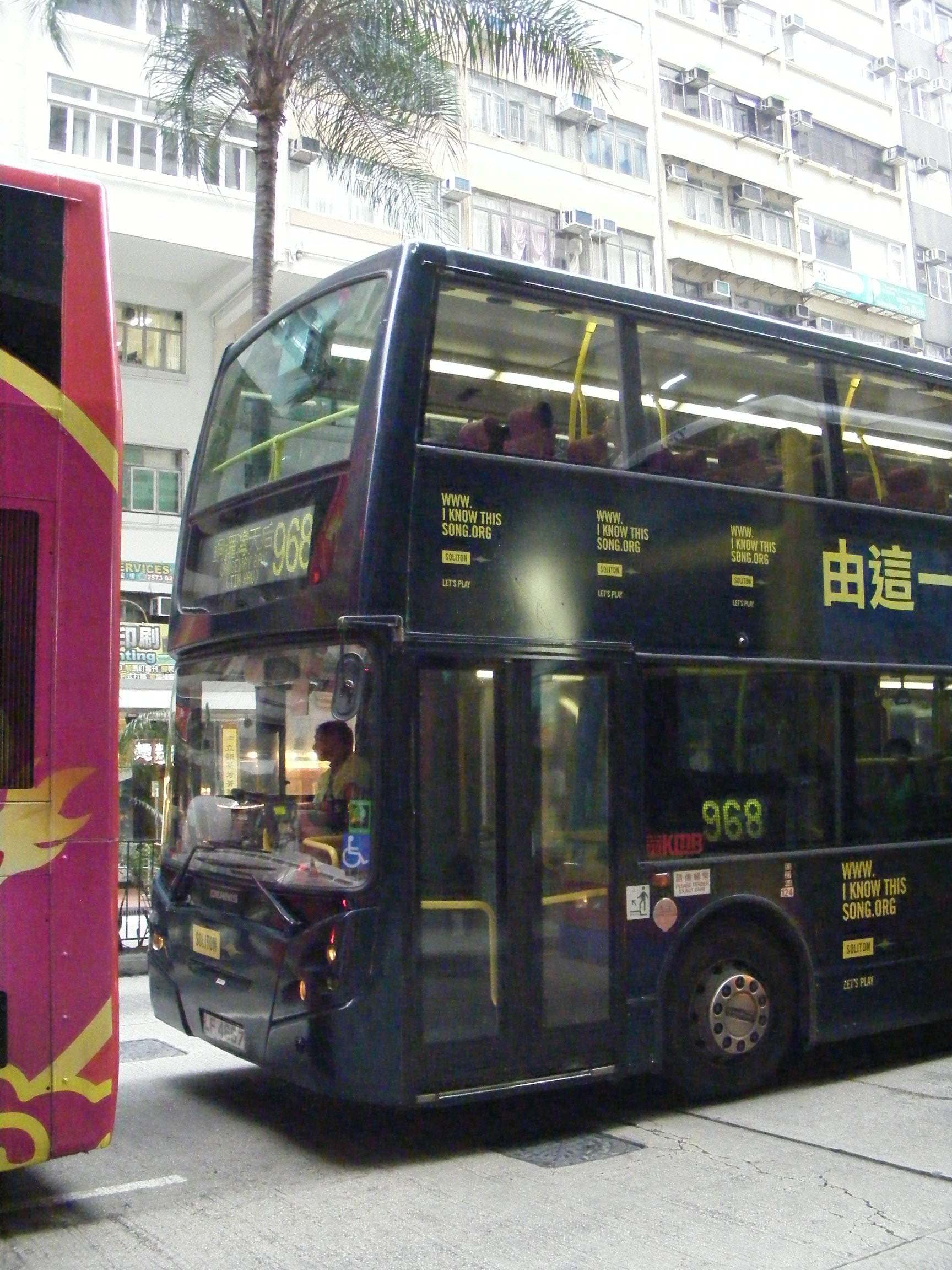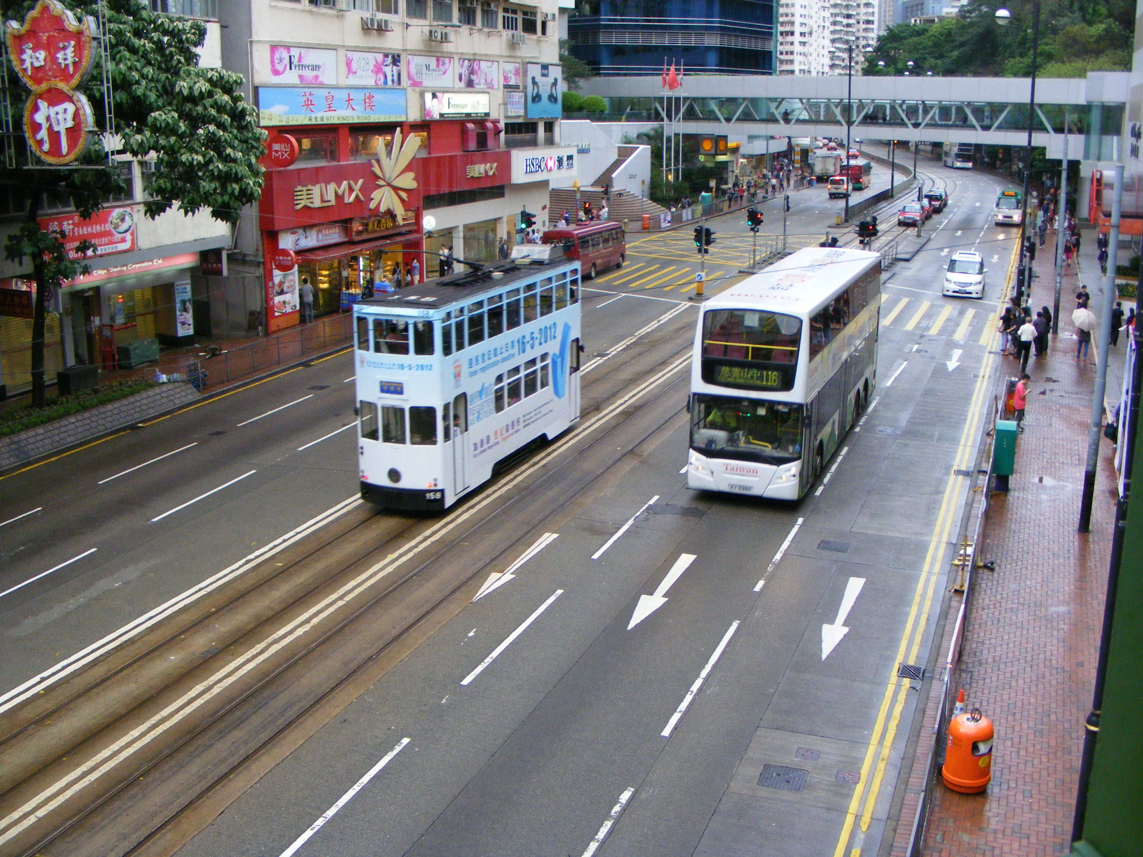 Earlier that day we have the rear view of the advert on Alexander Dennis Enviro500, ATEU21 (PJ6310) seen from the top deck of a tram, as orange Foodpanda tram 91 heads towards North Point.