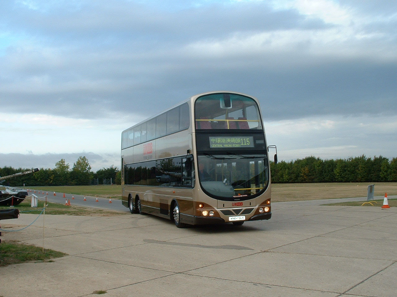 Following on from the KMB ALX500 bodied Dennis Trident, which took part in the Golden Jubilee Gold Run at SHOWBUS 2002, our friends at KMB provided one of the stars of SHOWBUS international 2003. The Volvo Super Olympian B10TL with Northern Ireland built Wright bodywork has been dubbed "The Wrightbus" at KMB. The impressive vehicle is seen arriving amongst the early contingent at Duxford, having driven down from Volvo's at Warwick prior to its journey to the former Crown colony. |
