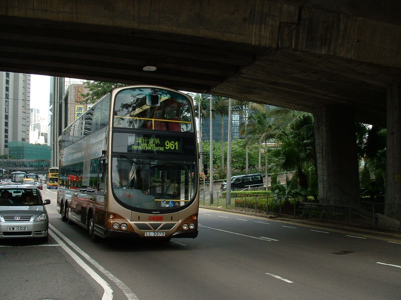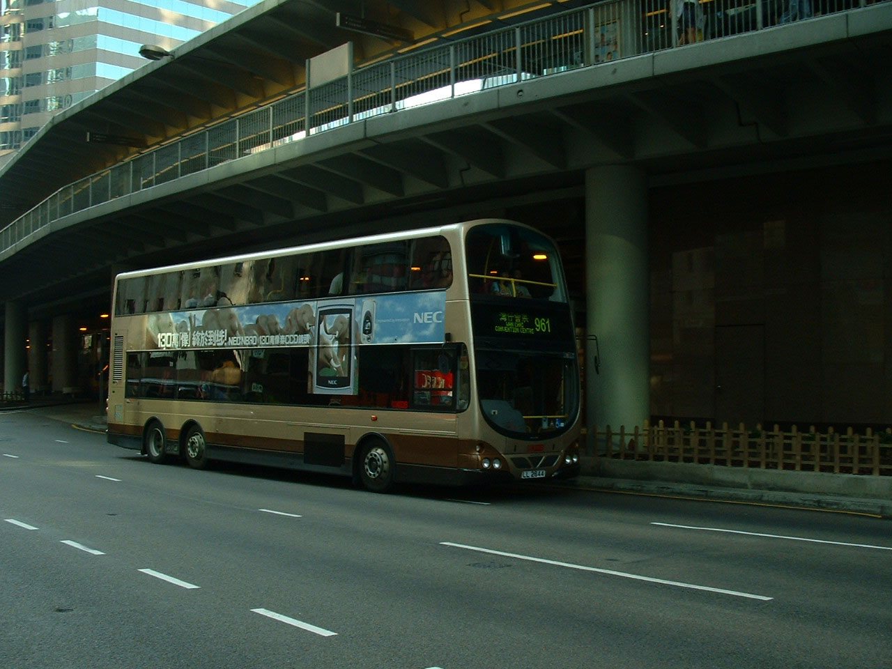 With such heavy traffic on Hong Kong Island there are several pedestrian bridges linking high level paths around the downtown area. They afford good vantage points for photography as with this view of AVW26 (LL3708) with a couple of Citybus deckers behind.