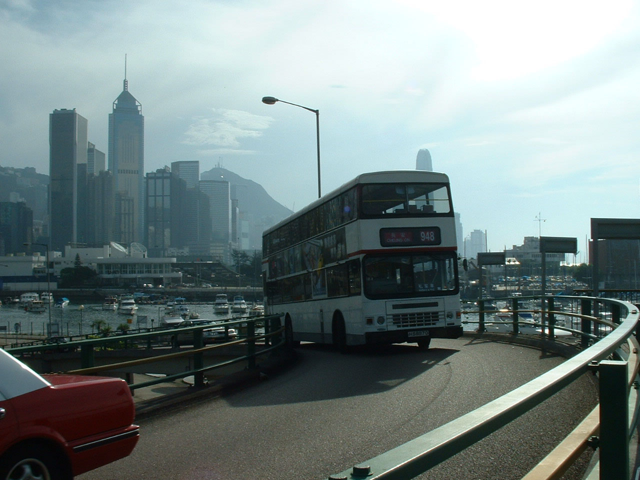 Seen at Causeway Bay, with a less dramatic backdrop in August 2001 is Dennis Dragon AD65 (FD1755) also with Duple Metsec framed bodywork, finished by Caetano in Portugal. The bus was built in 1992.